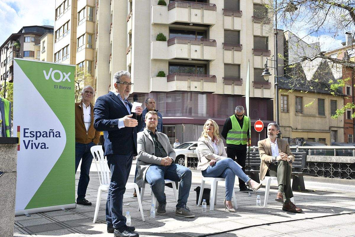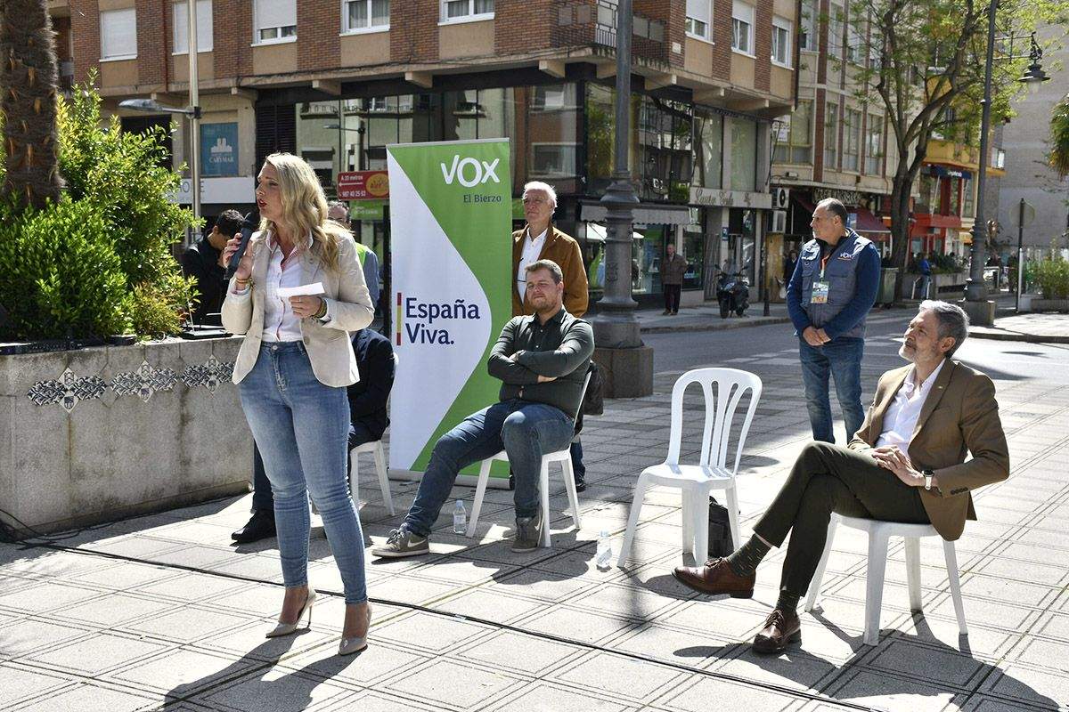 La candidata de VOX a la alcaldía de Ponferrada, Patricia González, ha celebrado este sábado un acto de precampaña acompañada de Pablo Calvo, diputado en el Congreso de los Diputados, Miguel Suárez, procurador en las Cortes de Castilla y León, y con la visita sorpresa de Carlos Pollán, presidente de las Cortes. En el acto en el que han intervenido todo menos Pollán, sentado en primera fila del público, González ha reseñado que su campaña estará basada en "cuidar de los nuestro" y esa es la idea que ha querido trasladas a los vecinos ponferradinos reunidos durante esta mañana