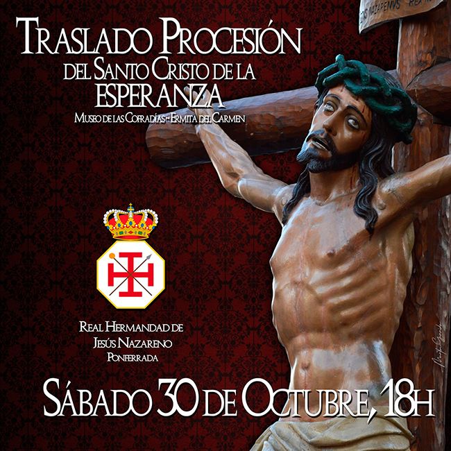 Después de dos años sin Semana Santa en Ponferrada, la ciudad volverá a sentir una procesión mucho antes de los actos de pasión 2022. Así, la Real Hermandad de Jesús Nazareno de Ponferrada trasladará al Cristo de la Esperanza el día 30 de octubre, desde el Museo de las Cofradías (antigua iglesia de San Antonio) hasta la Ermita del Carmen, debido a que el antiguo Cementerio del Carmen era el lugar donde se ubicaba en otros periodos históricos de Ponferrada.