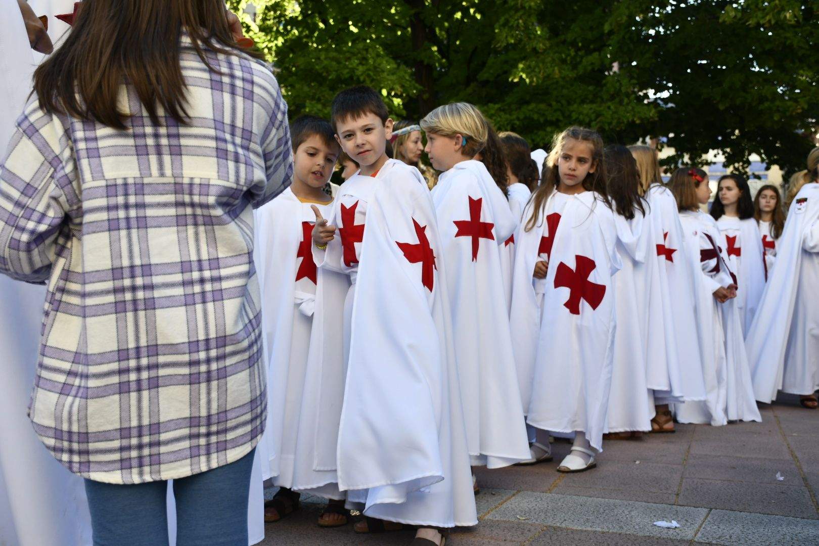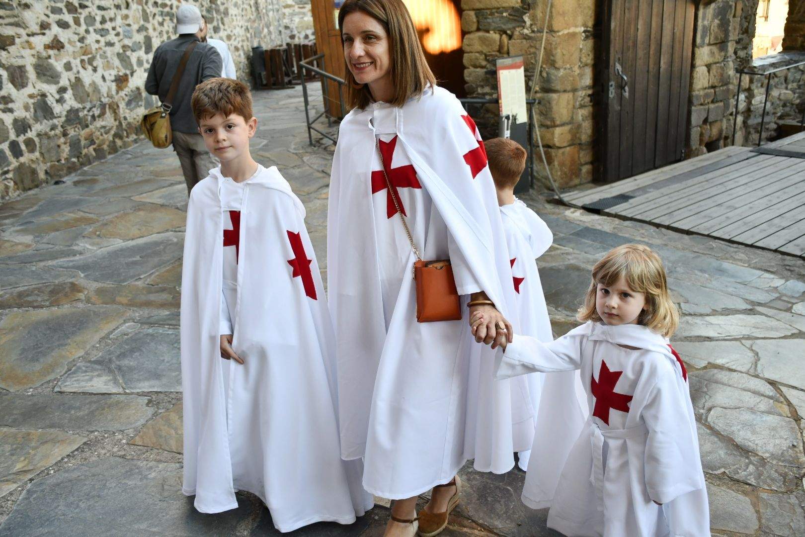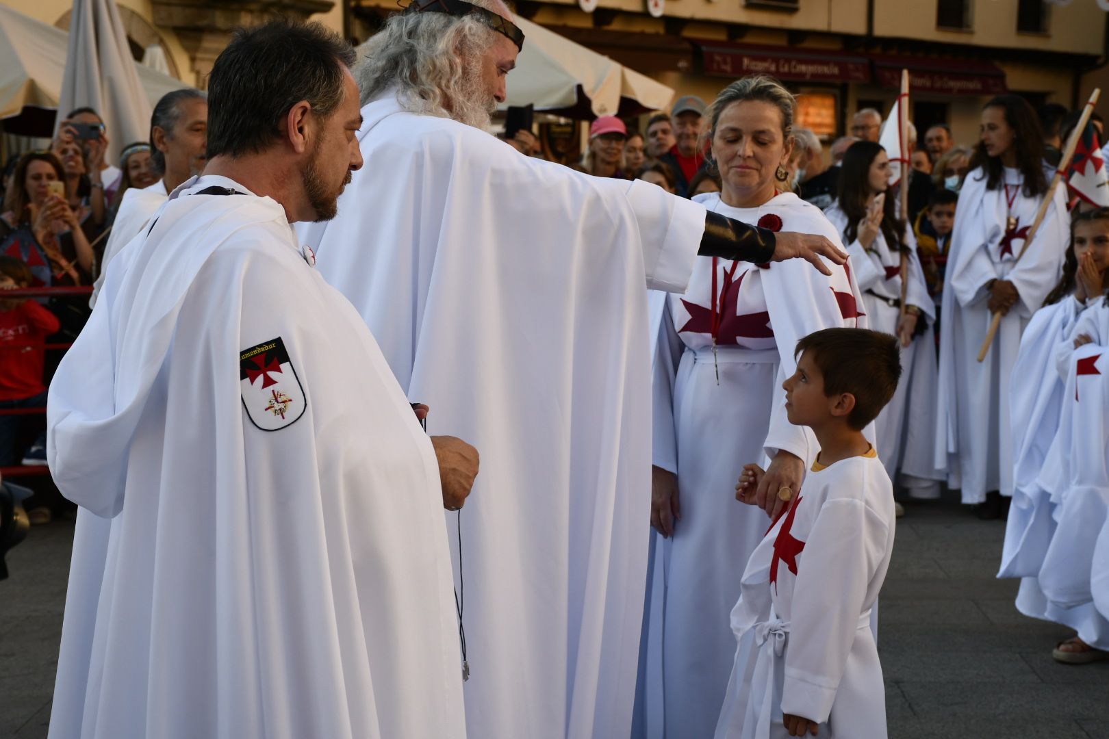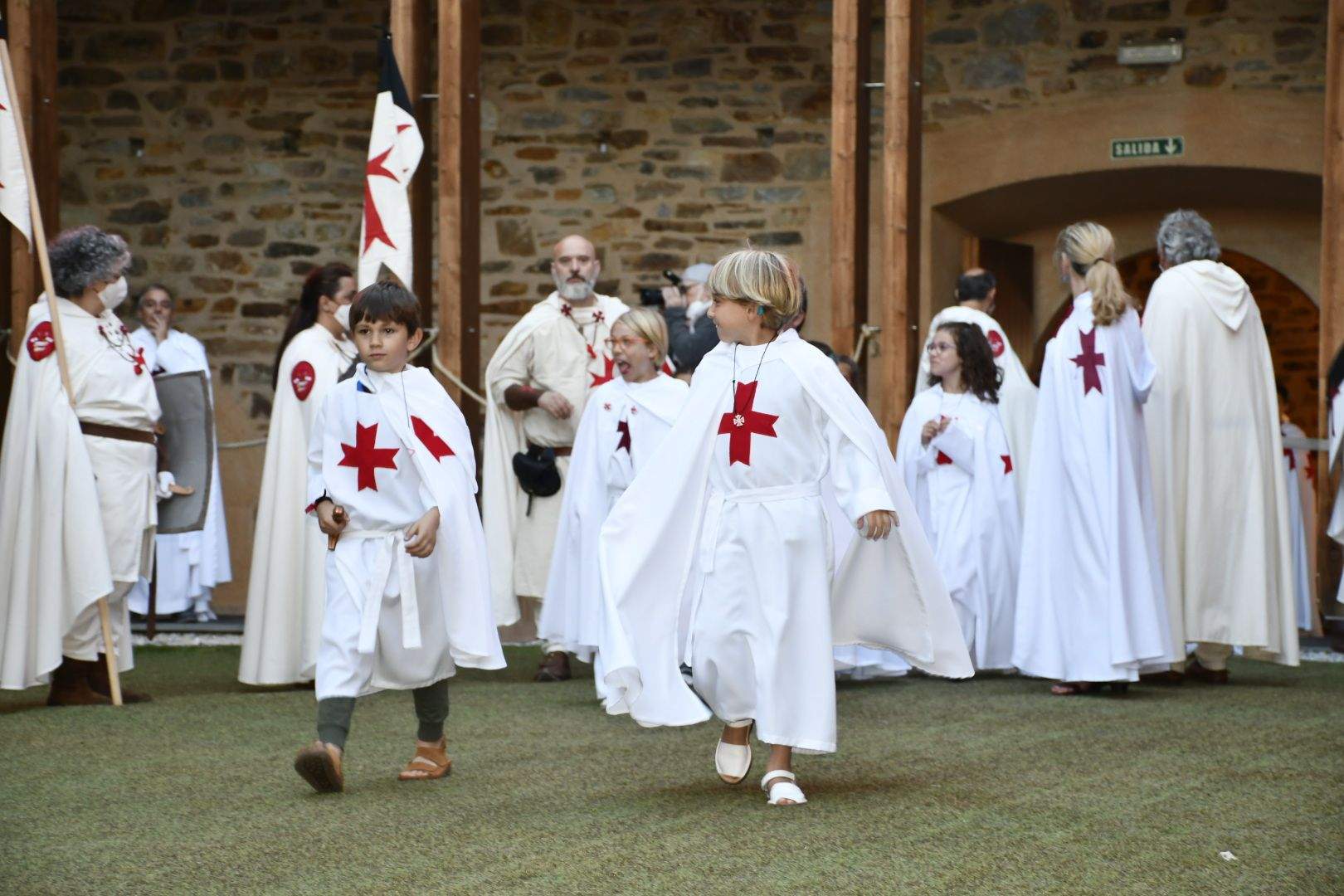La ciudad de Ponferrada, concretamente la Plaza de la Encina en el corazón del Casco Antiguo, ha reunido a los más pequeños para cumplir uno de los 'ritos' iniciáticos de La Noche Templaria, para convertirse en escuderos de la Orden del Temple. Tras dos años de parón por la crisis sanitaria, la Noche Templaria de Ponferrada ha vuelto y además renovada, con nuevos espacios y actos que permitirán a bercianos y turistas disfrutar de esta cita medieval con la llegada del verano. El mismo maestre Guido de Garda ha acompañado a los escuderos desde el Paseo San Antonio hasta la plaza, donde la imposición de mano y el colgante con la orden del Temple hace que nuevos 'relevos' empiecen a sumarse a este colectivo promotor de una fiesta ya referente en la ciudad.