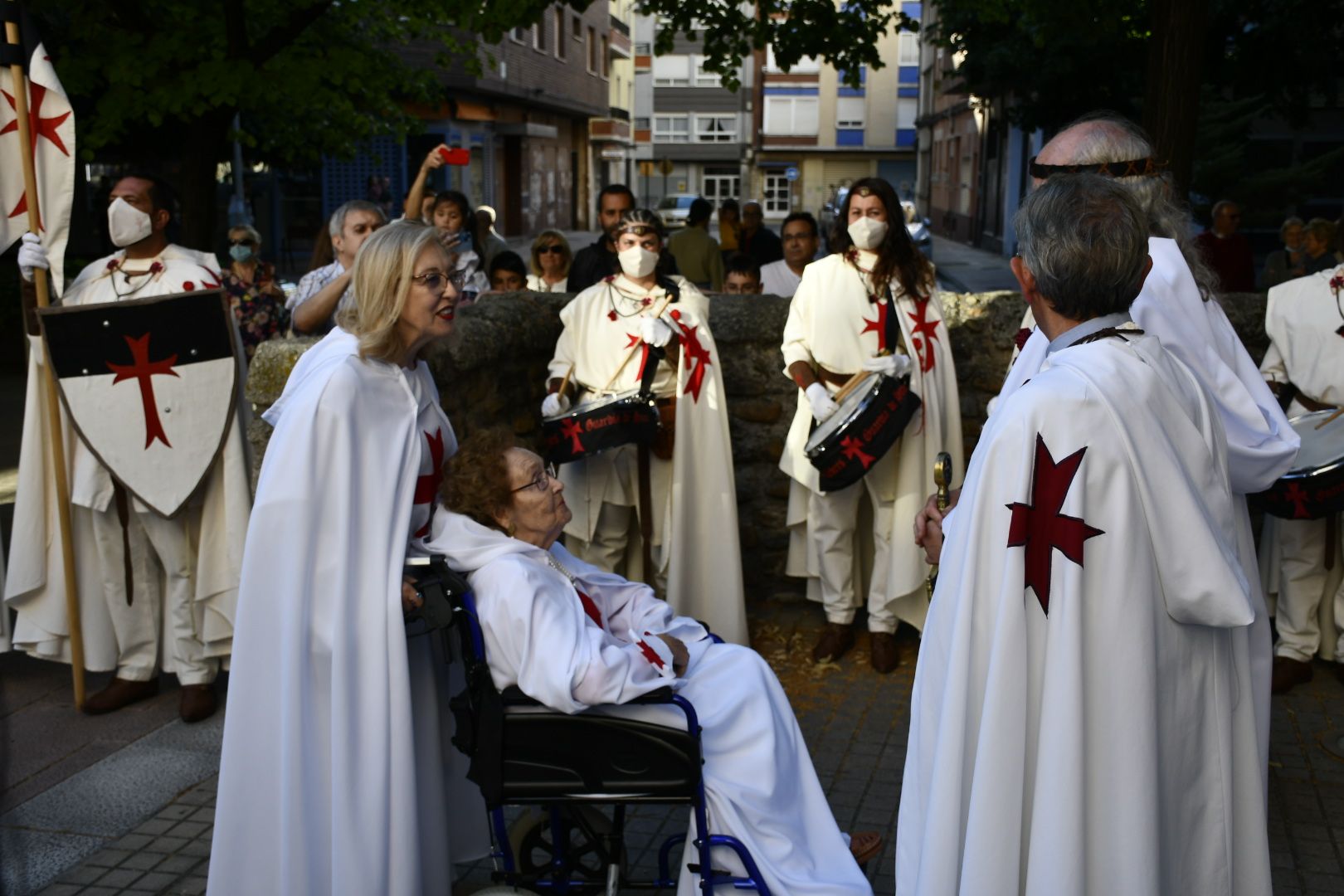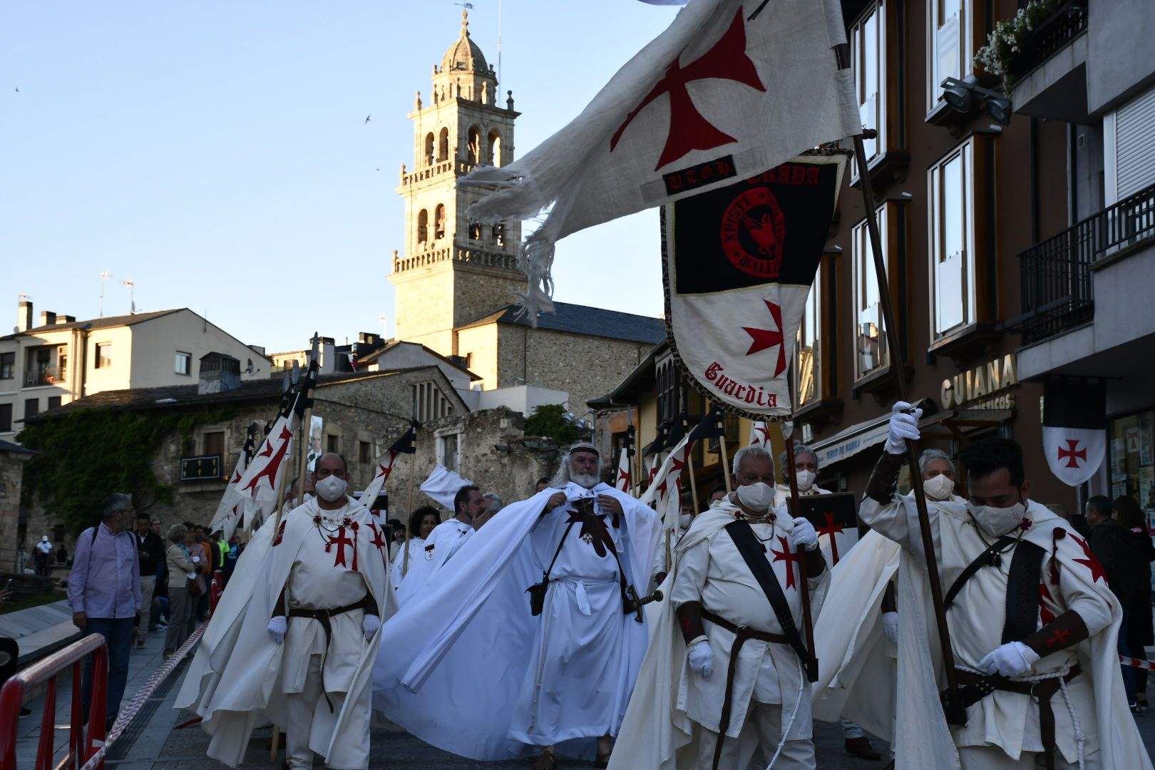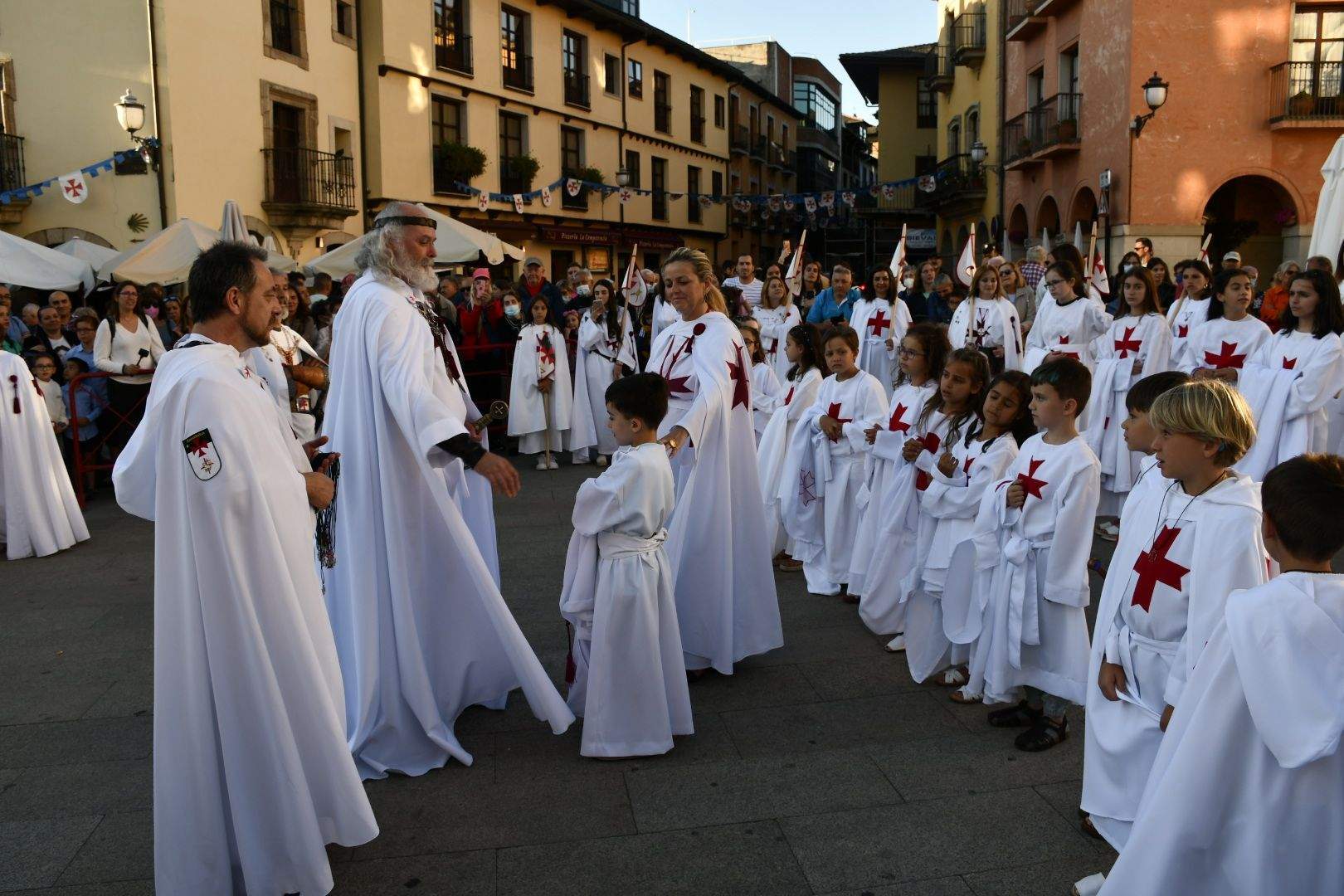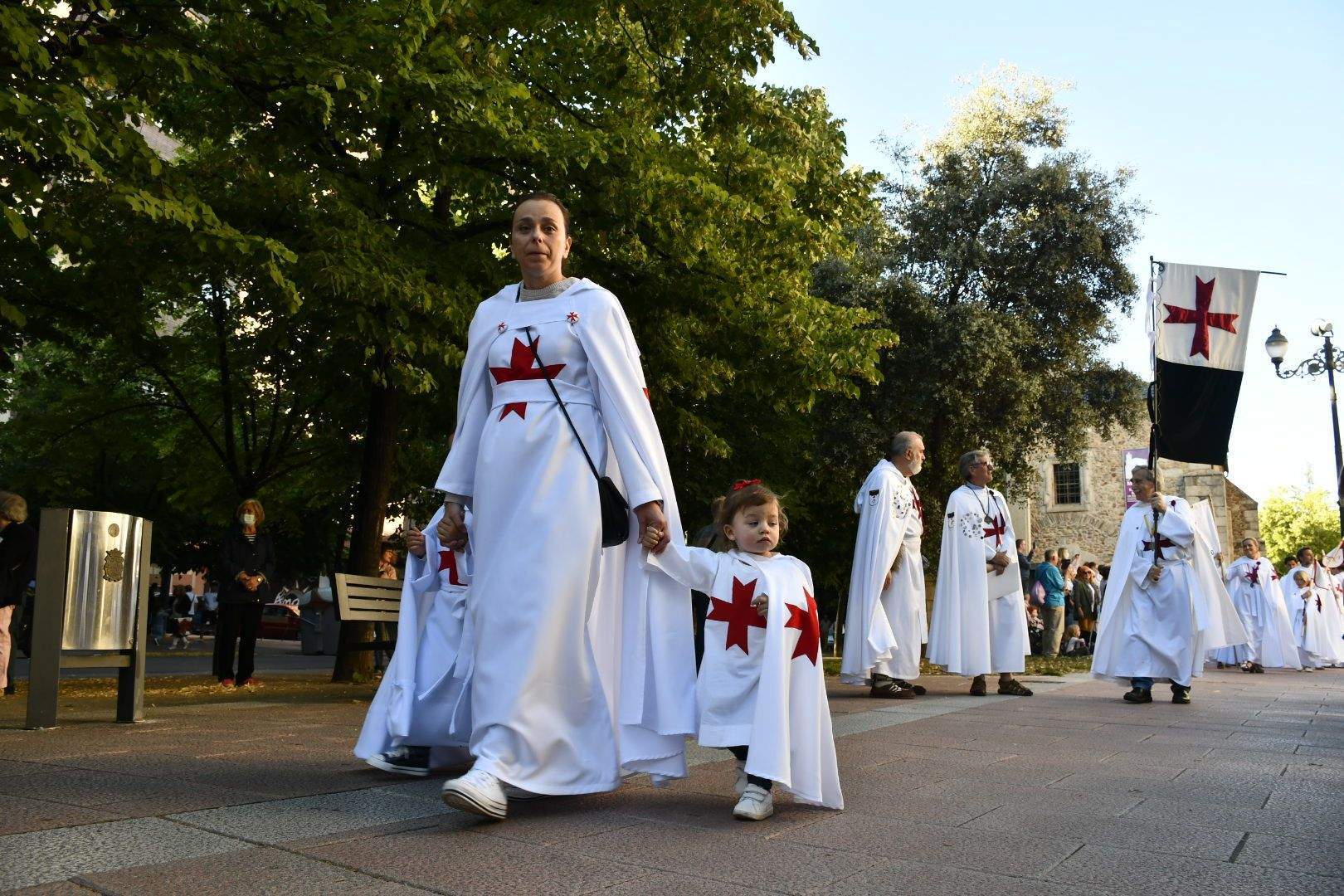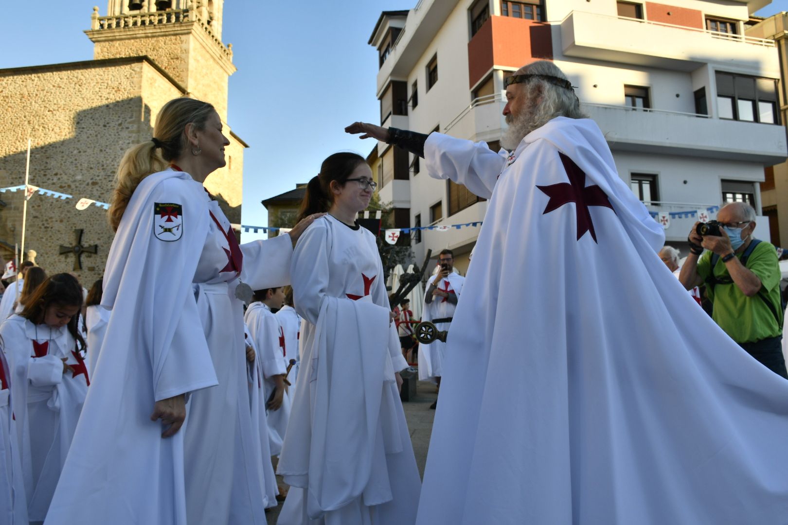 La ciudad de Ponferrada, concretamente la Plaza de la Encina en el corazón del Casco Antiguo, ha reunido a los más pequeños para cumplir uno de los 'ritos' iniciáticos de La Noche Templaria, para convertirse en escuderos de la Orden del Temple. Tras dos años de parón por la crisis sanitaria, la Noche Templaria de Ponferrada ha vuelto y además renovada, con nuevos espacios y actos que permitirán a bercianos y turistas disfrutar de esta cita medieval con la llegada del verano. El mismo maestre Guido de Garda ha acompañado a los escuderos desde el Paseo San Antonio hasta la plaza, donde la imposición de mano y el colgante con la orden del Temple hace que nuevos 'relevos' empiecen a sumarse a este colectivo promotor de una fiesta ya referente en la ciudad.
