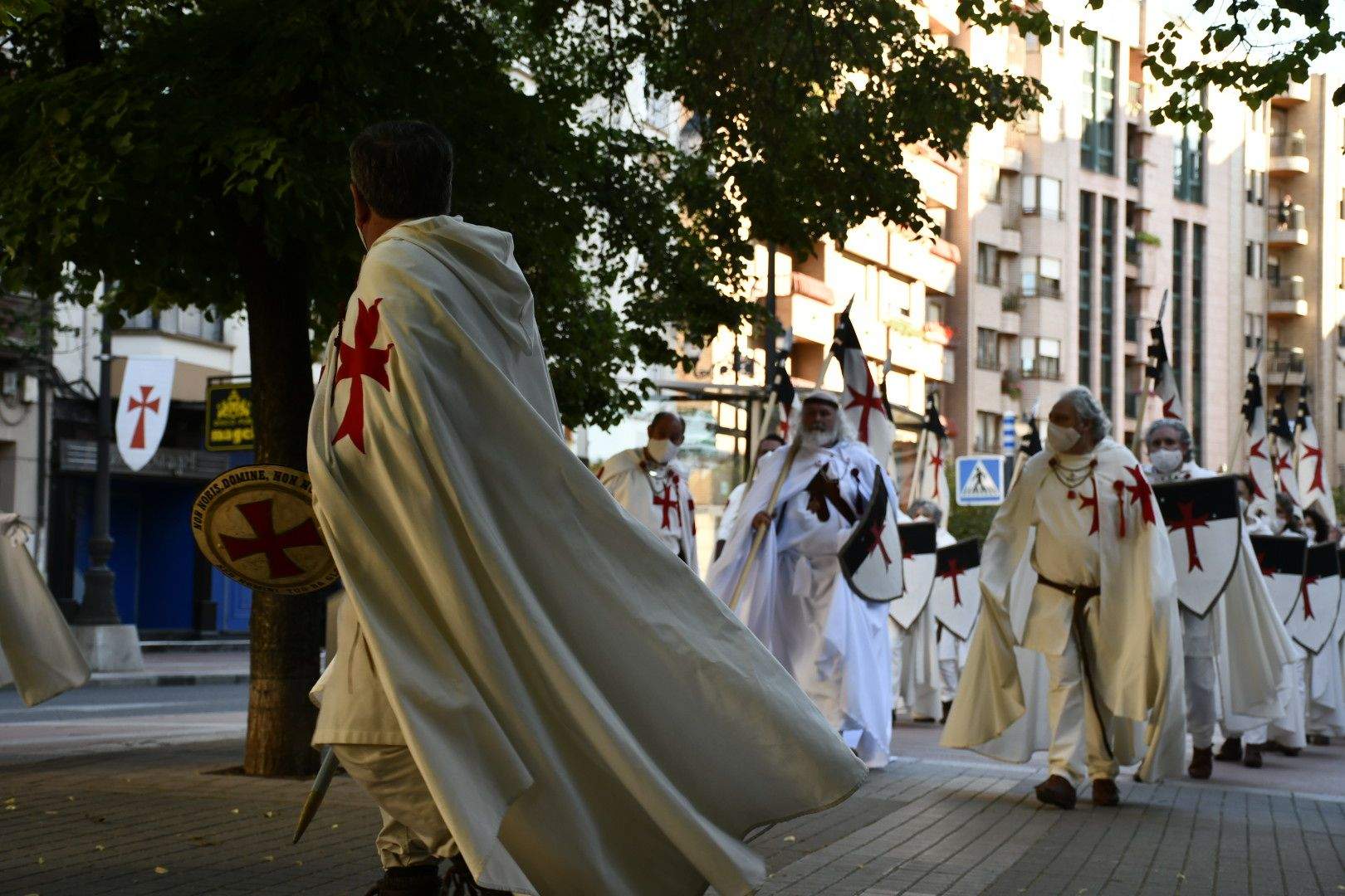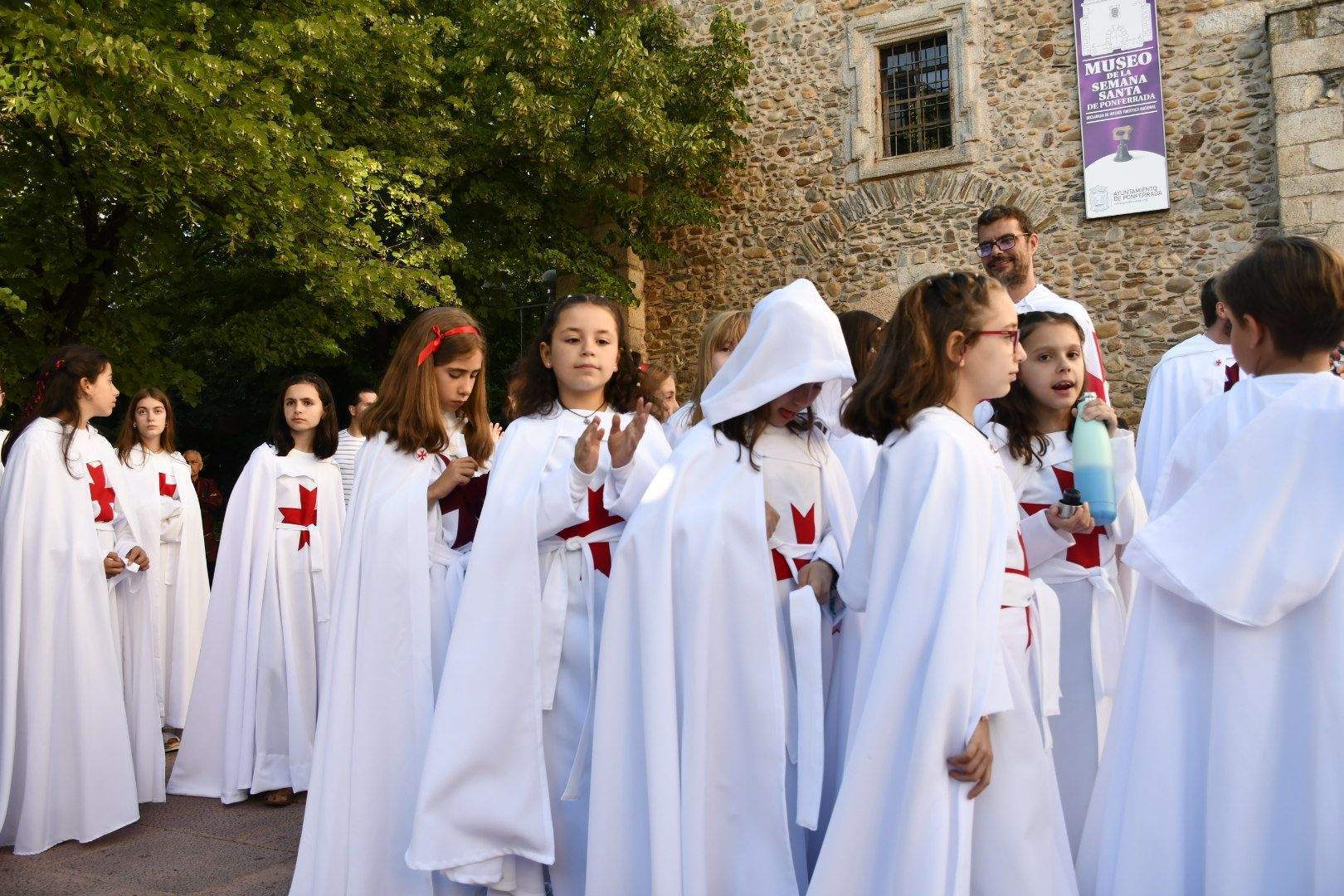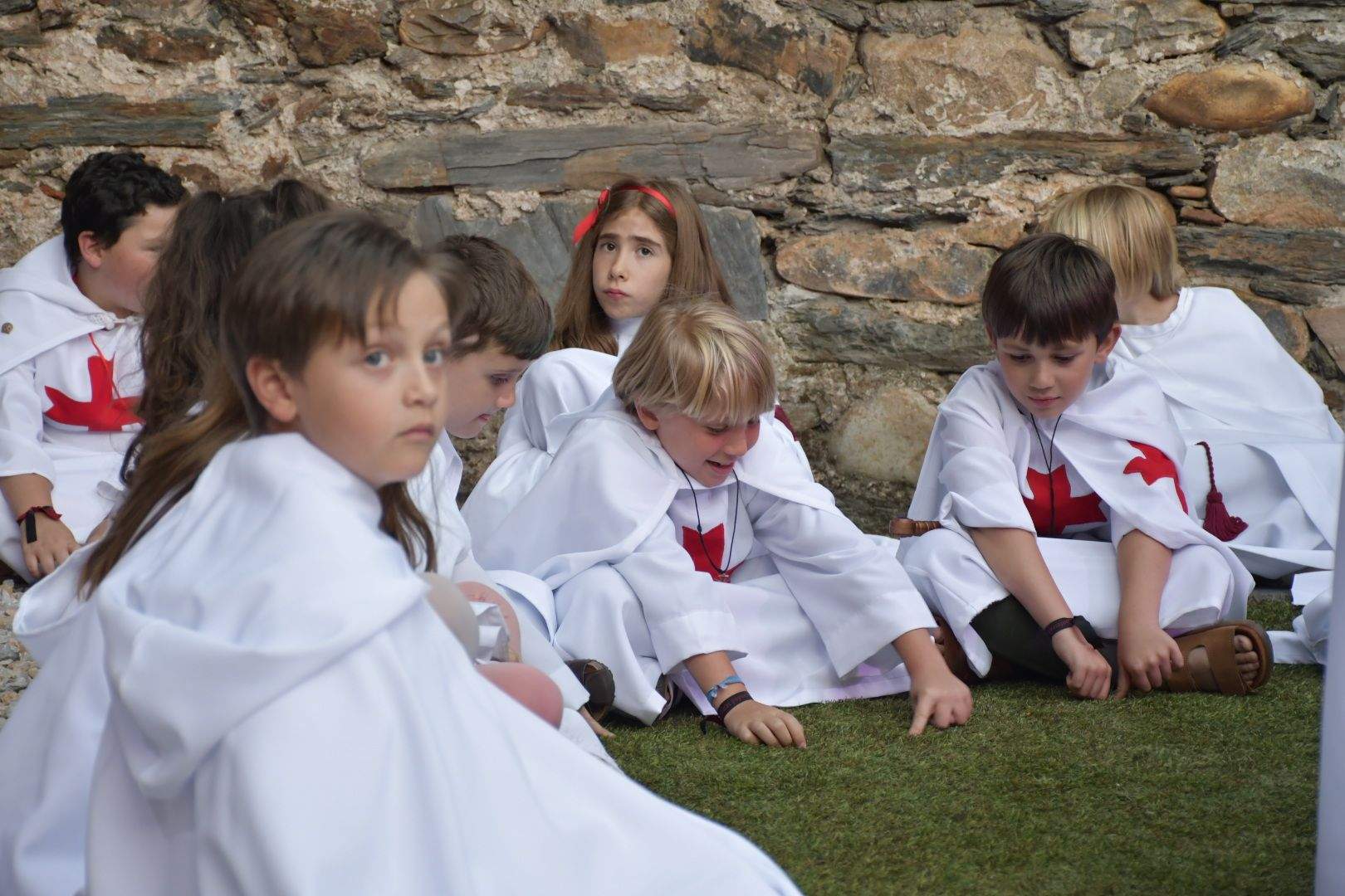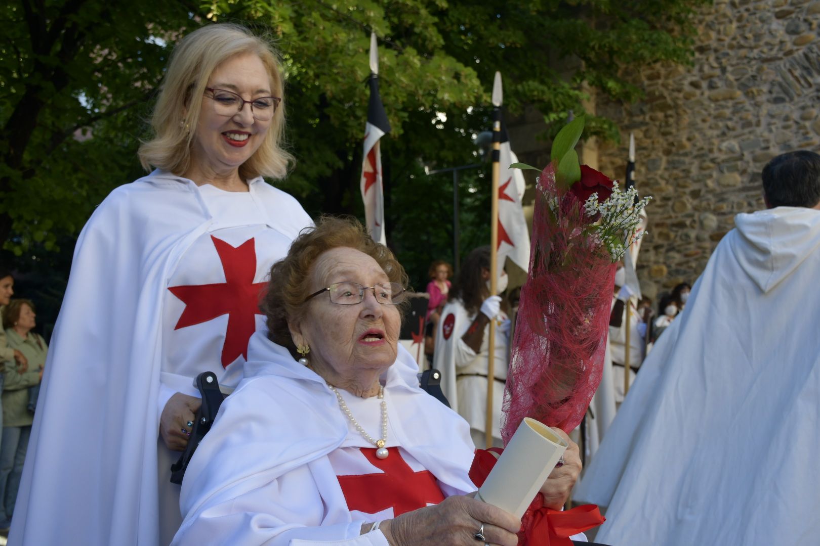 La ciudad de Ponferrada, concretamente la Plaza de la Encina en el corazón del Casco Antiguo, ha reunido a los más pequeños para cumplir uno de los 'ritos' iniciáticos de La Noche Templaria, para convertirse en escuderos de la Orden del Temple. Tras dos años de parón por la crisis sanitaria, la Noche Templaria de Ponferrada ha vuelto y además renovada, con nuevos espacios y actos que permitirán a bercianos y turistas disfrutar de esta cita medieval con la llegada del verano. El mismo maestre Guido de Garda ha acompañado a los escuderos desde el Paseo San Antonio hasta la plaza, donde la imposición de mano y el colgante con la orden del Temple hace que nuevos 'relevos' empiecen a sumarse a este colectivo promotor de una fiesta ya referente en la ciudad.