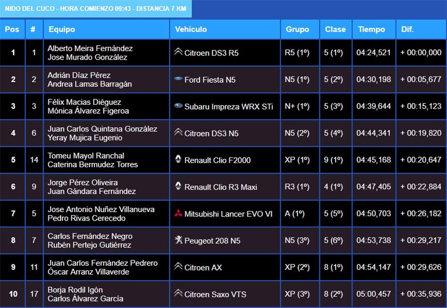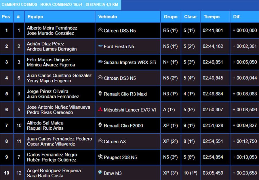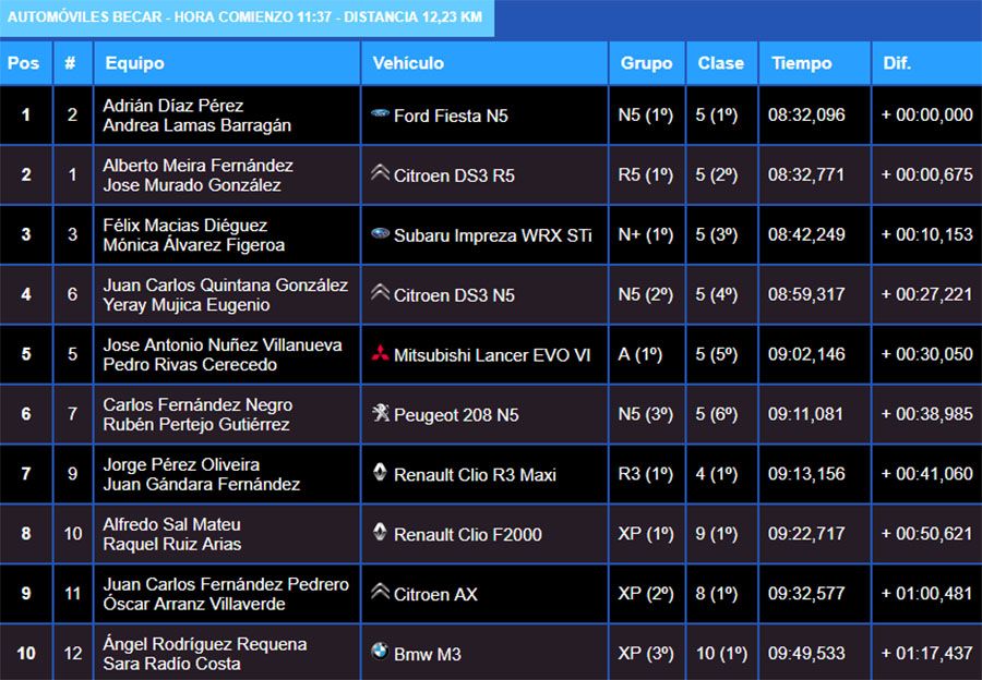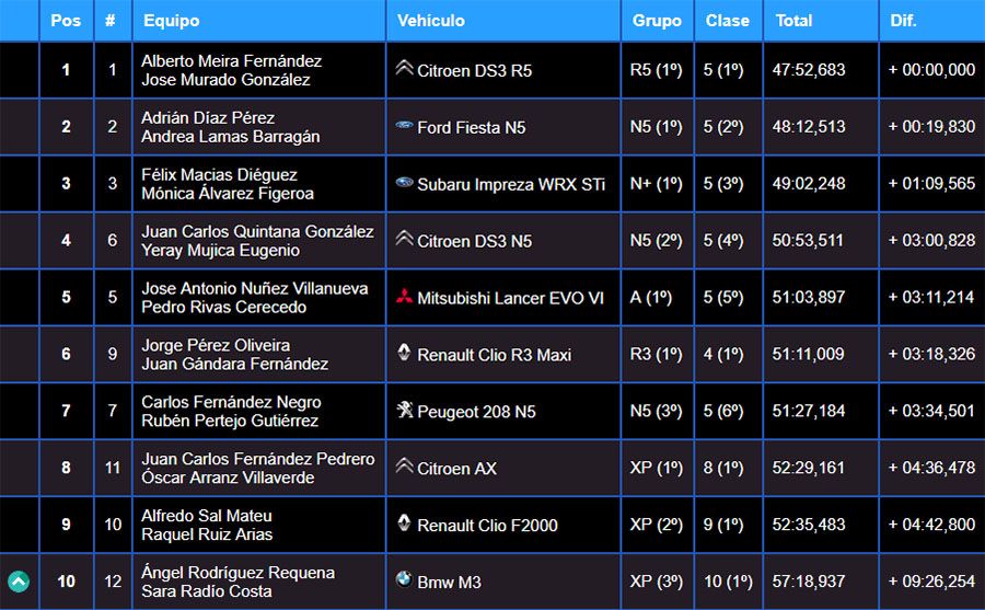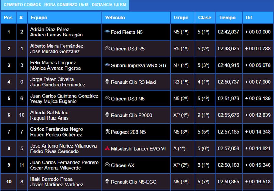 En segunda posición se han clasificado Adrián Díaz y Andrea Lamas con su Ford Fiesta N5 (Escudería Miño Lugo), con un tiempo total de 48:12 minutos, tras vencer en tres tramos. El ganador de las últimas dos ediciones del Rallye, Félix Macías, junto a la copilota Mónica Álvarez han conseguido el tercer puesto con un tiempo de 49:02 minutos en su Subaru Impreza WRX STi.