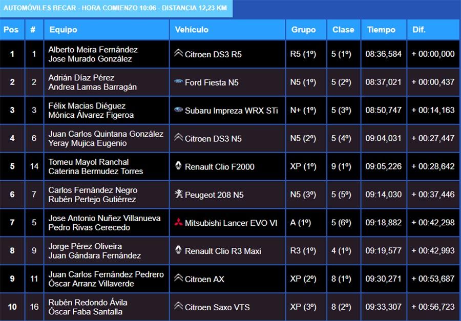 La primera pasada del TC3 entre Sobrado y Corullón (12,23 kms) ha concluido con la victoria de Alberto Meira (Citroen DS3 R5) en 8:36 minutos. Adrían Díaz Pérez y su Ford Fiesta N5 en segundo lugar con 8:37 minutos. Y en tercer lugar Félix Macías (Subaru Impreza WRX STi) con un tiempo de 8:50 minutos.