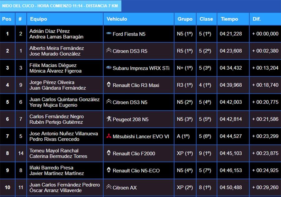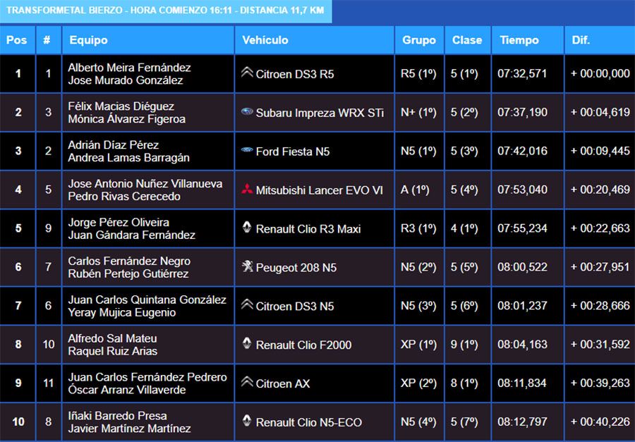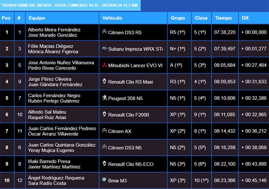 En la segunda vuelta del tradicional tramo de Corullón (TC5) Adrián Pérez logró el primer puesto en 8:32 minutos, seguido por Alberto Meira a menos de un minuto y Félix Macías en tercer lugar con 8.42 minutos.