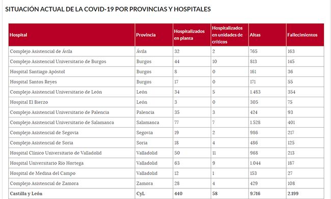 Tanto los datos en el Hospital El Bierzo como la cifra de fallecidos en las áreas de salud se mantienen igual que ayer. Respecto al centro hospitalario, tras las 2 altas contabilizadas el miércoles, hoy mantiene 3 pacientes ingresados en planta. Las altas desde el inicio de la pandemia suman 305 y los fallecidos 75.