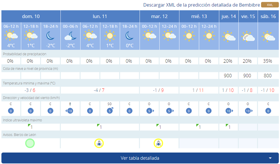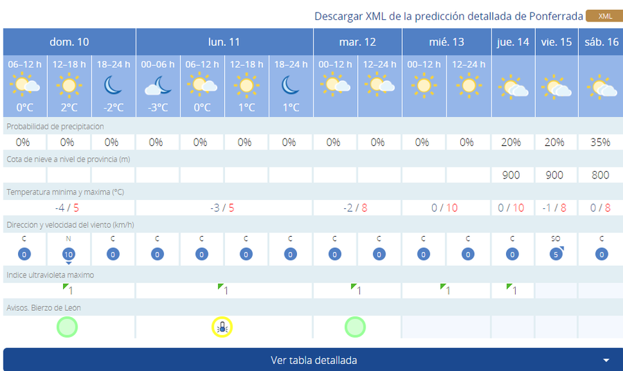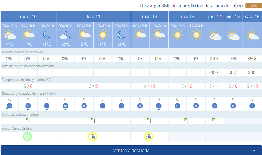 En Fabero este domingo la temperatura será de -3 grados de mínima frene a 6 de máxima. Parecida será la situación el lunes, con -2 de mínima y 8 positivos de máxima. El martes pese a que la máxima será de 10 grados la mínima cae hasta los -4. El miércoles las temperaturas suben con -2 de mínima y 12 de máxima, aunque el jueves también descienden ligeramente manteniendo los -2 y bajando la máxima a los 11.