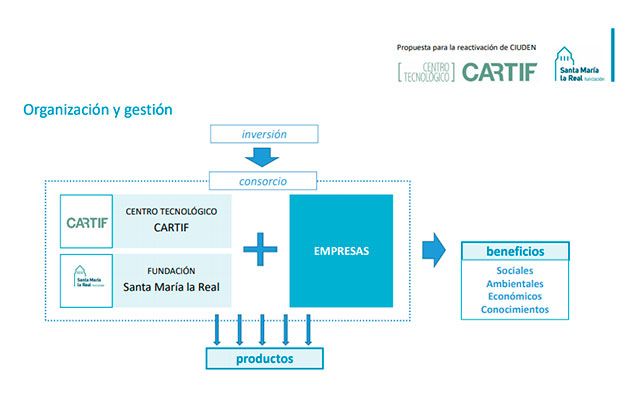 La iniciativa presenta la fórmula del consorcio, con Cartif, la Fundación Santa María la Real y empresas, como la mejor fórmula para llevar a cabo la reactivación de la Ciuden a través de las "cinco oportunidades" de actividad para sus instalaciones . La primera oportunidad que plantea este estudio técnico es la biorrefinería con el aprovechamiento de los recursos y revalorización de residuos -agroforestales y orgánicos, entre otros- del territorio para la producción de bioenergía y bioproductos y para la producción de CO2 comercializable.