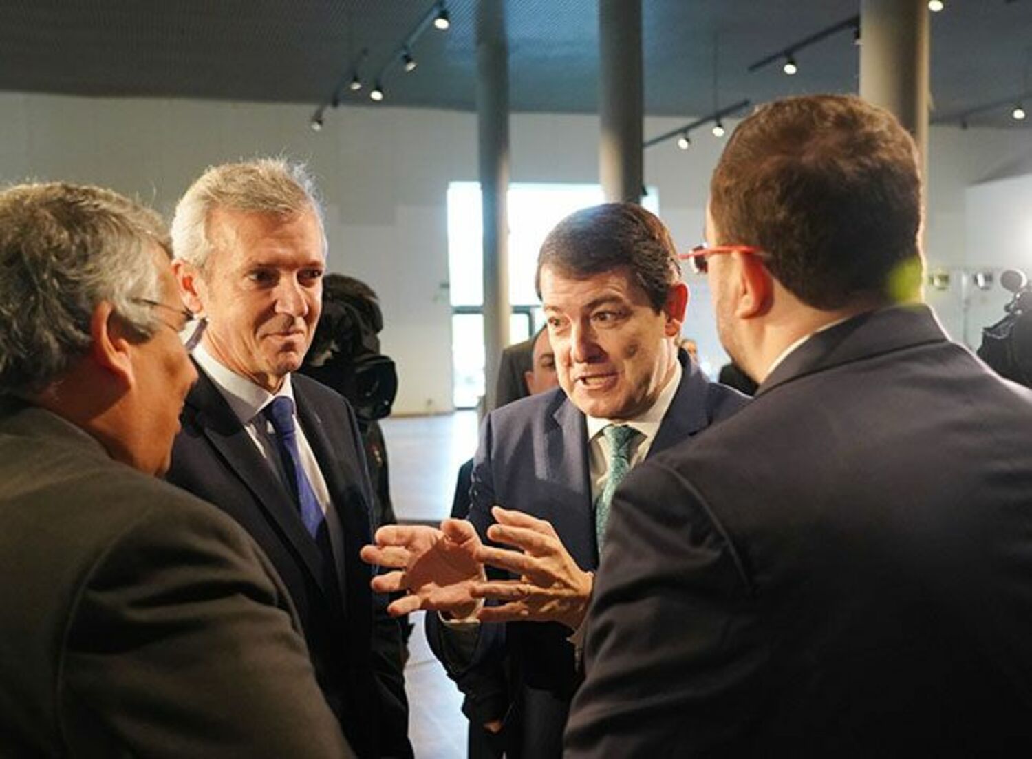 La jornada ‘Una estrategia conjunta para un proyecto común’ arrancó con el saludo de los tres presidentes de Castilla y León, Asturias y Galicia, Alfonso Fernández Mañueco, Adrián Barbón y Alfonso Rueda, quienes se hicieron una fotografía de familia con el resto de autoridades y mantuvieron un breve encuentro este jueves.