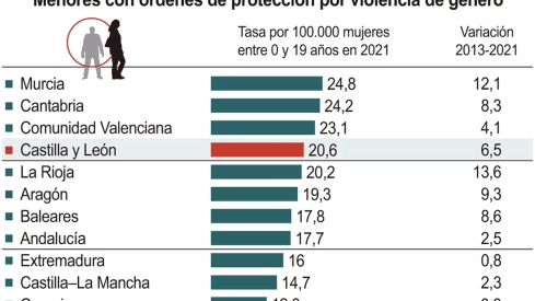Castilla y León registra la cuarta tasa más alta de menores con órdenes de protección por violencia de género del país con 20,6 casos por cada 100.000 habitantes, frente a los 14,9 de la media nacional. Además, según se desprende de un estudio de la Fundación ANAR, una organización sin ánimo de lucro que se dedica a la promoción y defensa de los derechos de los niños y adolescentes en situación de riesgo y desamparo.