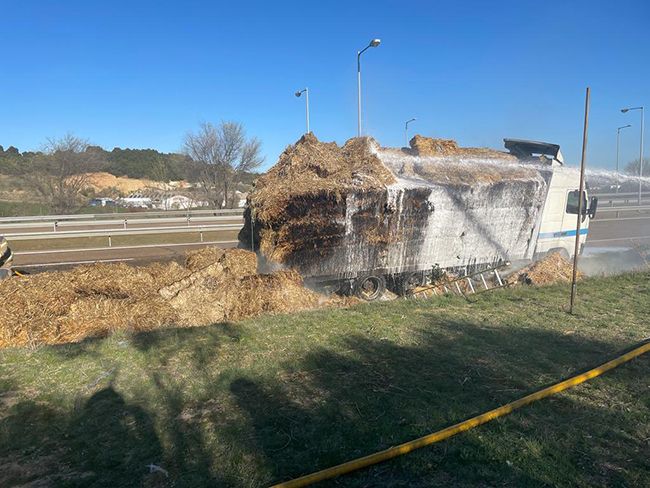 Cinco unidades de Bomberos de Valladolid participaron esta tarde en las tareas de extinción de un incendio registrado en un camión que transportaba paja a la altura del kilómetro 125 de la A-6, en el ramal de la salida de la avenida de Gijón.