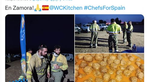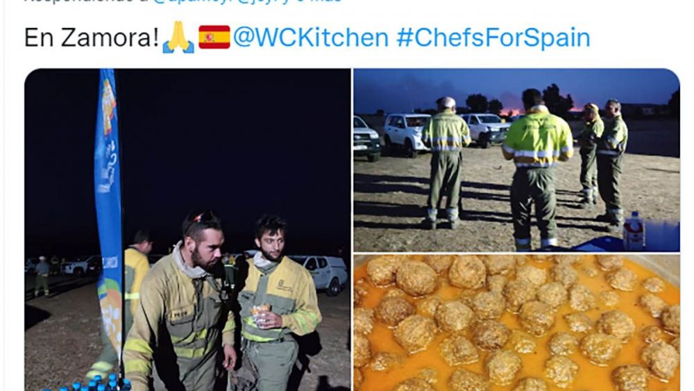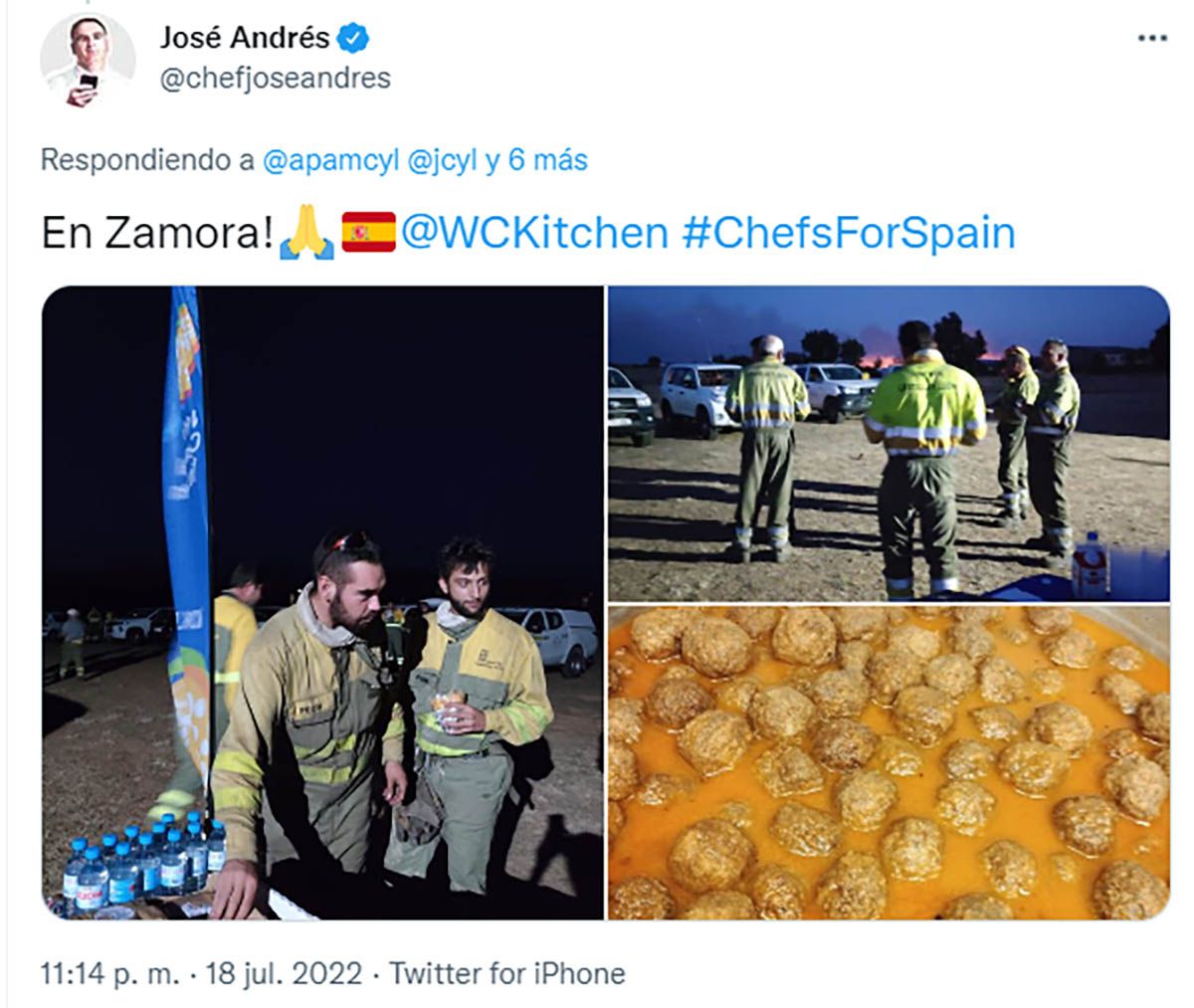 "Hola @chefjoseandres Estarás viendo noticias de incendios forestales en España, tenemos debate abierto por la precariedad de alimentación de @jcyl para los componentes del operativo de incendios. Las quejas vienen por el retraso, poca variedad y escasez. ¿Qué te parece?", le preguntaban en el tweet. A lo que el chef les contestó: "Hay que siempre alimentar bien, especialmente a las personas arriesgando sus vidas y trabajando sin paro ni descanso. Especialmente incendios. Ayuda a la moral y es importante que tenga las calorías necesarias para un trabajo intenso! Junta de Castilla y León, por favor, cuesta poco hacerlo bien".