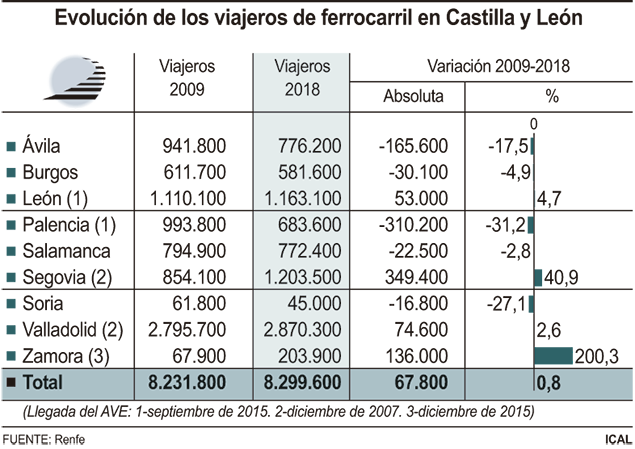 En el vagón de cola se sitúan las tres provincias de la Comunidad donde no está proyectada la llegada del AVE. Según los datos facilitados por Renfe Operadora a la Agencia Ical. Soria lidera la pérdida de viajeros y en los últimos diez años se registró una caída de viajeros del 27,1 por ciento, al pasar los 61.000 de 2009 a los 45.000 del pasado ejercicio; por delante de Ávila, con un descenso del 17,5 por ciento, hasta los 776.2000 viajeros (-165.600), y Salamanca, donde la caída ha sido del 2,8 por ciento, hasta los 772.400 viajeros. En Burgos, donde la Alta Velocidad llegará el próximo año, la caída desde 2009 ha sido del 4,9 por ciento, hasta bajar el número de usuarios hasta los 581.600.
