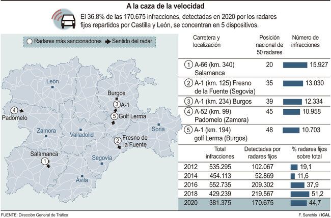 El pasado año, cuando el tráfico estuvo por una drástica reducción de la circulación provocada por el confinamiento y el estado de alerta, que en el caso de las carreteras de Castilla y León se tradujo en una caída de los desplazamientos de largo recorrido del 26%, descenso que los fines de semana alcanzó el 37,1%, los radares fijos de la DGT tramitaron 170.676 multas, lo que representa el 44,7% del total de infracciones, que alcanzaron las 381.376. Este porcentaje desciende ligeramente con respecto a los últimos dos años, cuando las multas de los radares suponían la mitad de todas las sanciones en carretera.