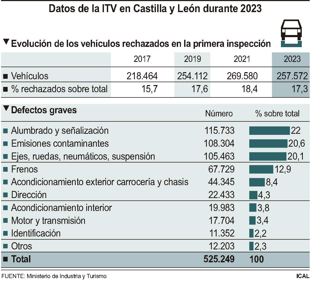 Según datos del Ministerio de Industria, Comercio y Turismo recogidos por Ical, el pasado año se registraron en la Comunidad 1.483.135 inspecciones, de las que el 17,3% resultaron negativas (257.572), en las que se detectaron un total de 525.249 defectos graves, los que automáticamente imposibilitan que un vehículo pueda superar la inspección técnica.