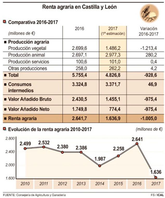 Ya hay cifras oficiales del impacto de la sequía que vivió Castilla y León durante el año pasado en el bolsillo de los agricultores de la Comunidad: 1.005 millones de euros. El primer avance de las cuentas económicas de la agricultura de Castilla y León del año pasado revela el alcance de la ausencia de lluvias sobre el sector, que cerró el ejercicio con una renta de 1.636,97 millones de euros, frente a los 2.641,79 del año anterior. Los datos ponen en evidencia que 2017 fue el peor año vivido por el sector desde 1992, cuando el desastre productivo fue aún mayor, y la renta agraria se situó en los 1.233 millones de euros.