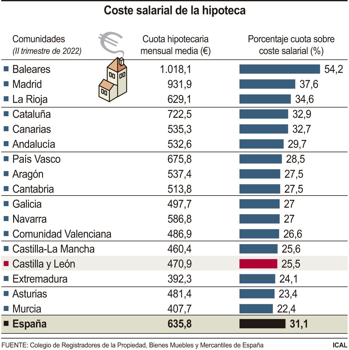 De hecho, Castilla y León es la cuarta autonomía con un menor porcentaje de cuota hipotecaria respecto al coste salarial, junto a la Región de Murcia (22,4 por ciento), el Principado de Asturias (23,4 por ciento) y Extremadura (24,1 por ciento). En el lado opuesto, con los mayores esfuerzos figuran Islas Baleares (54,2 por ciento), la Comunidad de Madrid (37,6 por ciento), La Rioja (34,6 por ciento) y Cataluña (32,9 por ciento).