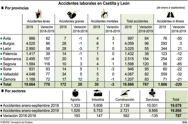 Un análisis territorial constata que los accidentes laborales mortales se registraron en mayor número en la provincia de León, siete, seguida por Burgos, seis; Valladolid, cinco; y Ávila y Segovia, con cuatro. Asimismo, en Zamora perdieron la vida dos trabajadores, y en Palencia uno y en Soria, otro. Sólo se libró de esta lacra en los nueve primeros meses del año, Salamanca.