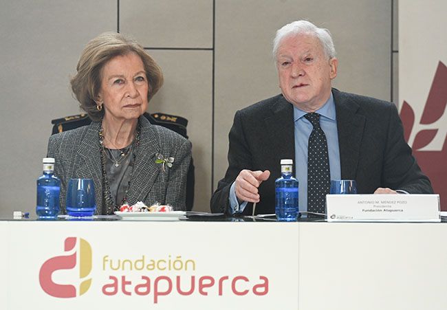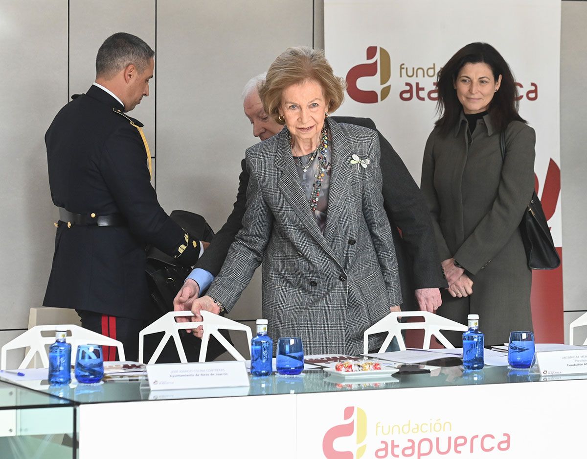Elegante y sonriente, vestida con un traje de chaqueta en tonos grises y azulados, la reina emérita fue saludada por el presidente de la Fundación Atapuerca, Antonio Méndez Pozo; el consejero de Cultura, Turismo y Deporte, Gonzalo Santonja; la secretaria general de Investigación del Ministerio de Ciencia e Innovación, Raquel Yotti; así como por el alcalde del municipio, José Ignacio Colina;