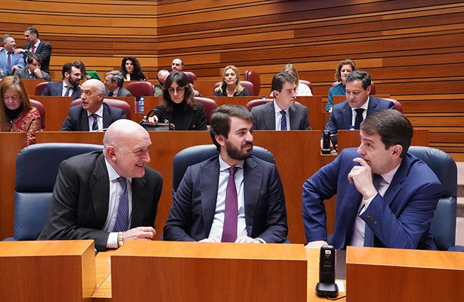 Miriam Chacón / ICAL. El consejero de Presidencia Jesús Julio Carnero junto al vicepresidente de la Junta Juan García Gallardo y el presidente de la Junta de Castilla y León Alfonso Fernández Mañueco en el Pleno extraordinario de las Cortes