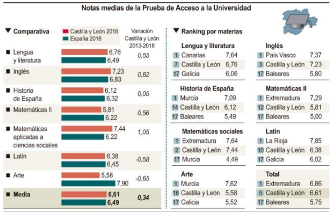 Según los datos del Ministerio de Ciencia, Innovación y Universidades consultados por la Agencia Ical, los alumnos de Castilla y León obtuvieron en la última Selectividad una nota media del 7,36, por encima de la media nacional del 7,28. La Comunidad se sitúa por detrás de Extremadura (7,64), Canarias (7,60), Murcia (7,50), Aragón (7,43) y País Vasco (7,40).