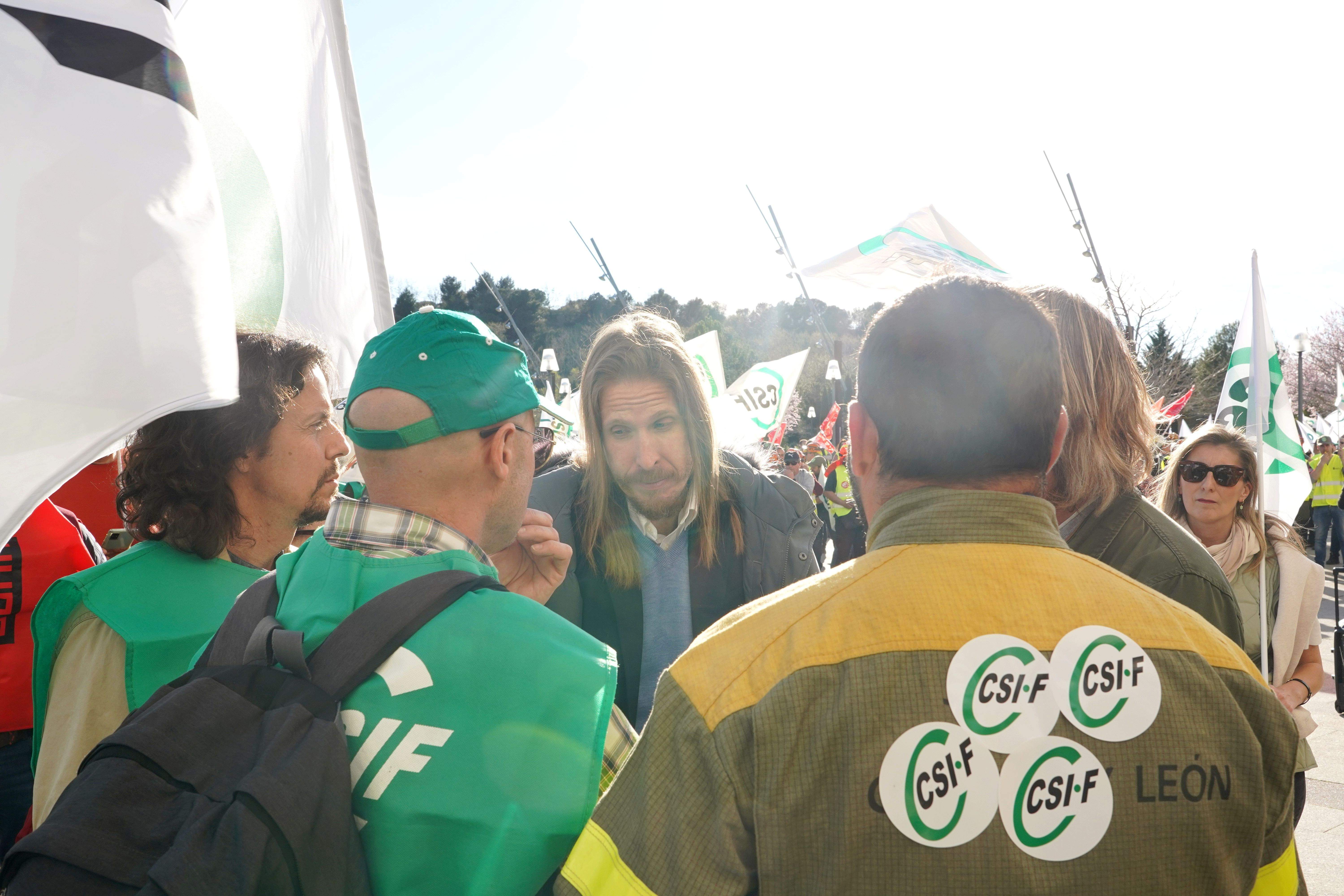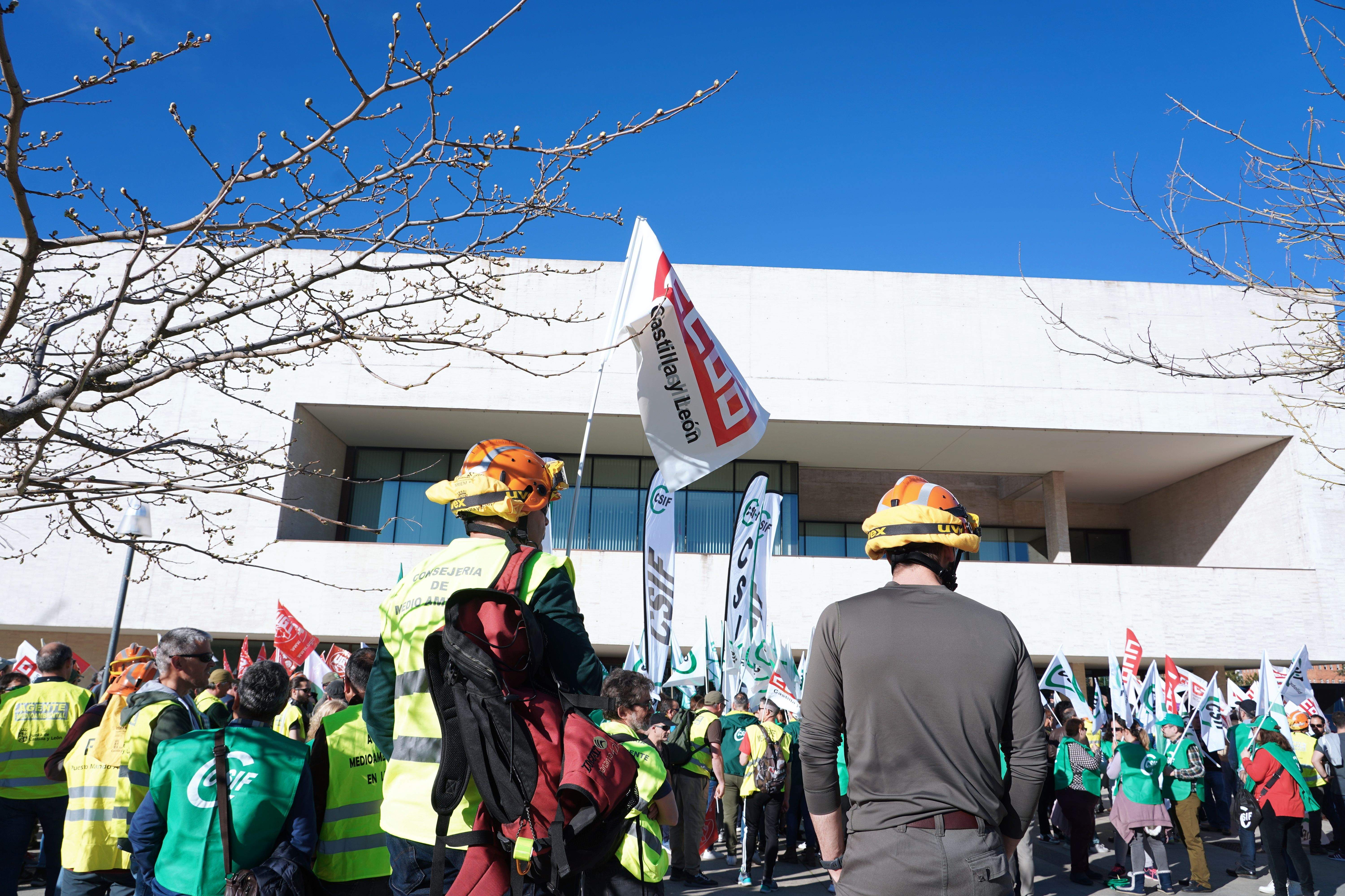Los trabajadores del operativo de incendios forestales se movilizan por el futuro decreto que regulará esta actividad y las guardias, convocados por CSIF, UGT, CCOO y Uscal.CSIF, UGT, CCOO y Uscal movilizaron este martes a estos profesionales desde toda la Comunidad, con seis autobuses fletados, hasta las puertas del parlamento, donde unas 400 personas exigieron al Suárez-Quiñones que “acerque posturas” tras dos reuniones “sin posibilidades de acercamiento”, y advirtieron de que están estudiando la convocatoria conjunta de una huelga si mañana en otro encuentro convocado con la consejería no se avanza.