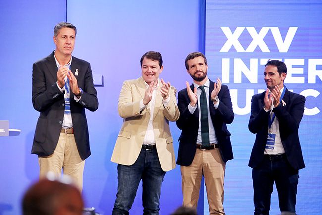 El presidente nacional del PP, Pablo Casado, y el presidente del PP en Castilla y León, Alfonso Fernández Mañueco, en la XXV Intermunicipal del Partido Popular. Junto a ellos, el presidente del PP de Badalona, Xavier García Albiol; y el portavoz del PP en el Ayuntamiento de Castelldefels, Manuel Reyes