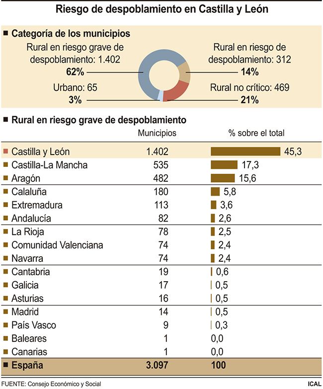 En este último ámbito, también Castilla y León lidera, en términos totales, el conjunto de municipios de su territorio en riesgo de despoblamiento, con 312, que representan el 37,4% del total nacional de este tipo de núcleos, reduciéndose la representatividad en relación a la superficie, con 11.145 kilómetros cuadrados que suponen el 20% del territorio ocupado por municipios de este tipo en España, y a la población, dado que los 110.987 habitantes que viven en estas localidades en Castilla y León representan también una quinta parte del total nacional.
