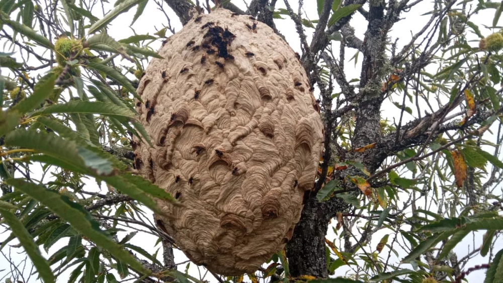 Efectivos de los Bomberos de Rionegro del Puente, del Consorcio Provincial de la Diputación de Zamora, retiraron este viernes en Puebla de Sanabria (Zamora) un nido de avispa asiática de grandes dimensiones que se encontraba en la parte superior de un árbol.