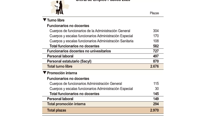 De las plazas de nuevo ingreso que se convocarán, 1.079 corresponden a la Administración General, 582 de las cuales son de personal funcionario y 497 son de personal laboral. Además, se contempla la convocatoria de 870 plazas de personal estatutario de instituciones sanitarias (Sacyl), y 727 de docentes -301 correspondientes al cuerpo de maestros y 426 al resto de cuerpos.