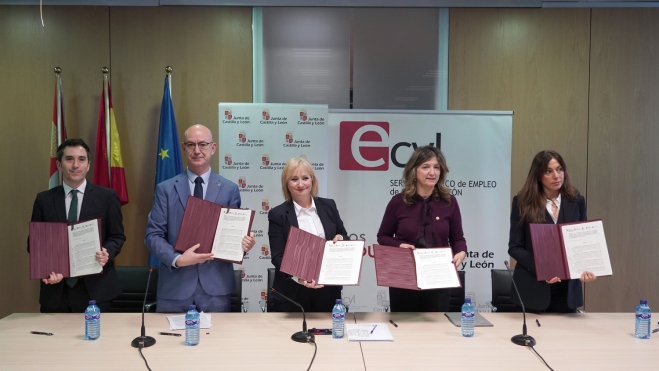 La consejera de Industria, Comercio y Empleo, Leticia García; el rector de la Universidad de Burgos, José Miguel García; la rectora de la Universidad de León, Nuria González; el vicerrector de Transferencia, Innovación y Emprendimiento de la Universidad de Salamanca, Federico Bueno; y la vicerrectora de Comunicación, Cultura y Deporte de la Universidad de Valladolid, Rebeca San José, suscribieron este martes en la capital del Pisuerga, un acuerdo de colaboración que busca facilitar y promover la inserción profesional de 4.000 jóvenes universitarios y estudiantes de FP en el tejido productivo de la Comunidad.