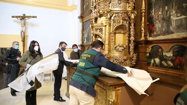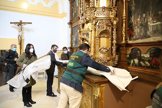 La iglesia de Santa Marina acogió el acto de entrega de las tablas, que contó con la presencia del obispo de Zamora, Fernando Valera; el párroco de Barcial del Barco (Zamora), Santiago Martín, y el delegado episcopal de Patrimonio, José Ángel Rivera; el subdelegado del Gobierno en Zamora, Ángel Blanco; el jefe del Departamento de Delincuencia contra las Personas y el Patrimonio de la Unidad Central Operativa de la Guardia Civil, Javier Rogero; el jefe del Grupo de Delitos contra el Patrimonio, también de la UCO, Roberto Tirado, y personal técnico de la Dirección General de Patrimonio Cultural y Bellas Artes del Ministerio de Cultura y Deportes, encabezado por el subdirector de Registros y Documentación del Patrimonio Histórico, Carlos González.