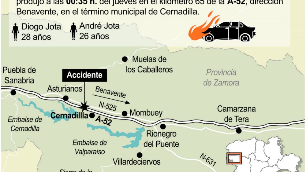 El futbolista portugués que milita en el Liverpool de la Premier League inglesa, Diogo Jota, y su hermano André Silva fallecieron esta madrugada tras sufrir una salida de vía con el vehículo en el que circulaban por el kilómetro 65 de la A-52, en el término municipal de la localidad zamorana de Cernadilla.