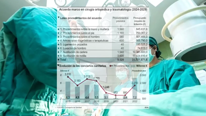 También se ha estimado el concierto de 40 cirugías por luxación de hombro, con 74.913,20 euros; 1.940 sustituciones de cadera, con 10,9 millones, y hasta 3.520 operaciones para sustitución de rodilla, con 17,62 millones.