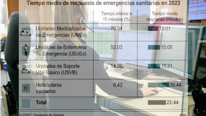 Los servicios de emergencias sanitarias en Castilla y León tardaron algo menos de 23 minutos (22.44) en atender a la población en el último año, lo que implicó recortar en más de tres el tiempo que transcurre desde que el centro coordinador de urgencias recibe la llamada hasta que llega el primer recurso de Emergencias Sanitarias al lugar del incidente.