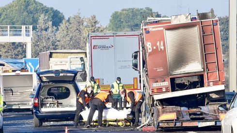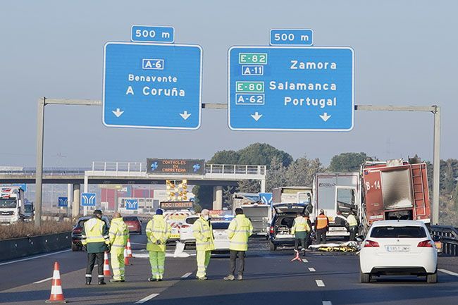 El centro de emergencias 112 Castilla y León recibió varias llamadas, minutos después de las 7,30 horas, que informaban de un accidente en el kilómetro 183 de la A6, en Tordesillas (Valladolid), sentido Coruña, con tres camiones implicados, uno de ellos incendiado, y varias personas en el suelo.
