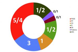 En base a estos porcentajes, sin contar el porcentaje de indecisos, el PSOE lograría 4 ó 5 escaños por 3 el PP. Entre 1 y 2 Socialistas por Cacabelos e Izquierda Unida, con 1 Ciudadanos entraría en el Ayuntamiento, y pugnan por lograr representación con menos opciones CB y Podemos.
