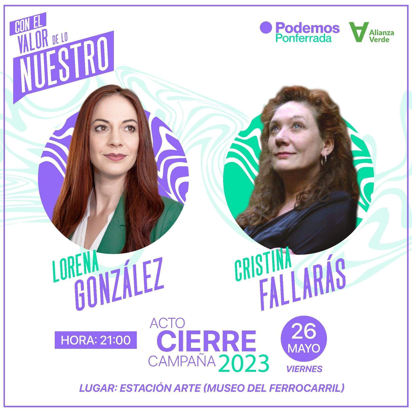 La campaña electoral ya tiene las horas contadas y los partidos buscan ese colofón final antes de la jornada de reflexión y la jornada electoral. Podemos Ponferrada - Alianza Verde y su candidata Lorena González, han escogido el viernes a las 21 horas que despedir la campaña.