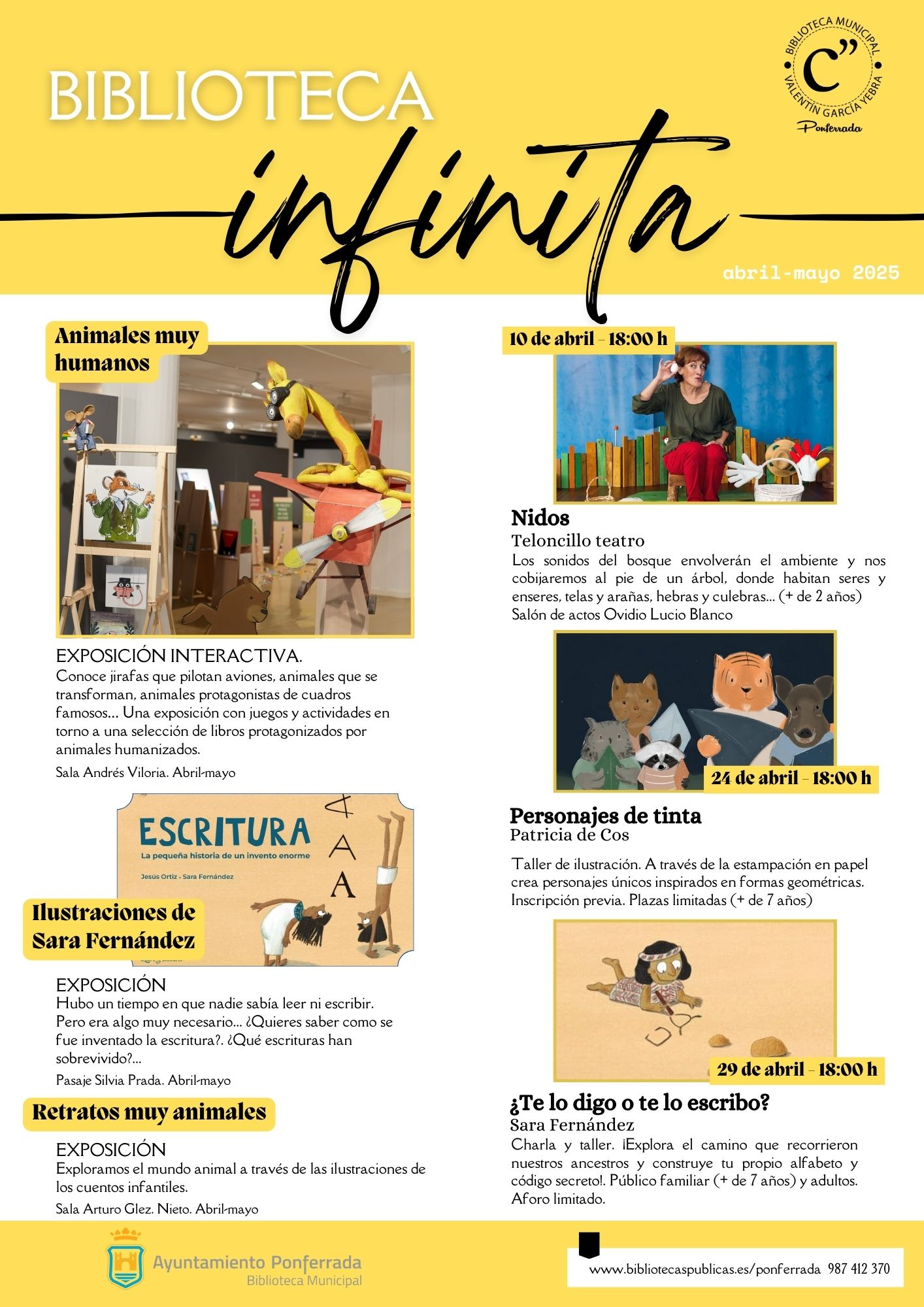 El Ayuntamiento de Ponferrada impulsa el proyecto ‘Biblioteca Infinita’, una iniciativa que sustituye al Salón del Libro Infantil, que se celebraba desde el año 1999, y que concentraba actividades para los niños en la Biblioteca Municipal durante tan solo unos días, en el mes de abril. Ahora, con la ‘Biblioteca Infinita’ habrá diferentes iniciativas a lo largo de todo el curso escolar, con el objetivo de que los niños se acerquen a los libros.
