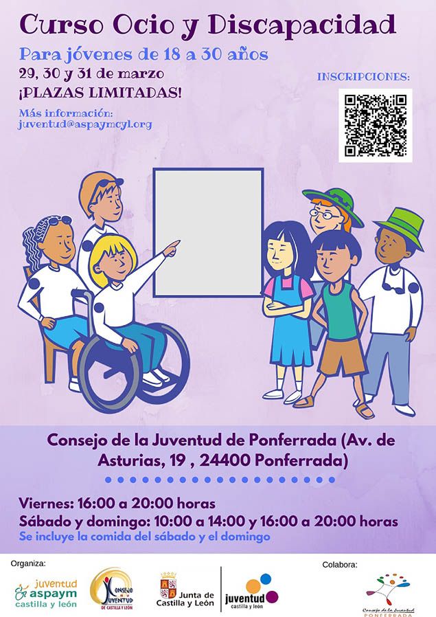 La asociación Aspaym Castilla y León y el Consejo de la Juventud de Castilla y León abrieron este jueves el plazo de inscripción para el curso de ocio y discapacidad que se celebrará en Ponferrada los días 29, 30 y 31 de marzo. Dirigido a jóvenes de entre 18 y 30 años, el curso se impartirá de forma gratuita en la sede del Consejo de la Juventud de la capital berciana y tendrá una duración de 20 horas, repartidas en tres módulos.