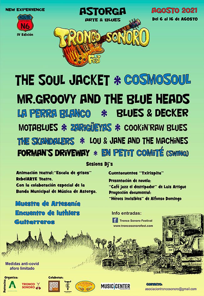 The Soul Jacket, Cosmosoul, La Perra Blanco, En Petit Comité (Swing) y muchos más estarán presentes en Tronco Sonoro. Además habrá animación teatral, Cuentacuentos, presentación de novelas, muestras de artesanía, encuentro de luthiers y guitarreros.
