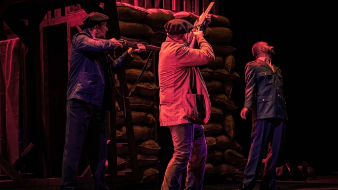 La compañía Saltantes Teatro se encarga del montaje de Alija, quien ha adaptado este texto publicado en cuatro volúmenes que narra, a través de 1.000 páginas, la Revolución del 34 que se vivió en la cuenca minera asturiana retratada a través de las palabras de Zapico, Premio Nacional de Cómic.