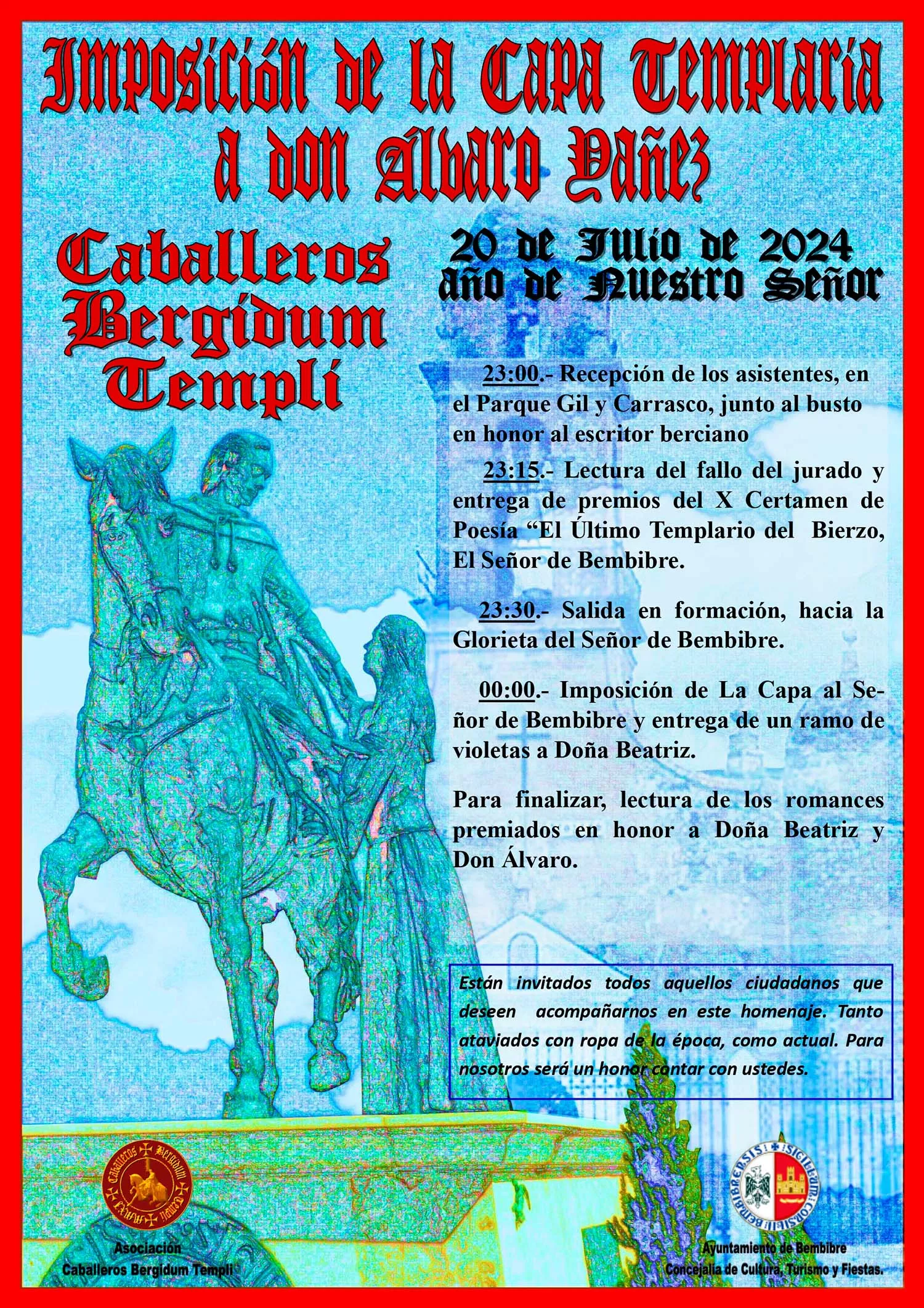 El sábado a las 23:15 horas tendrá lugar la lectura del fallo del jurado y otorgarán los premios del X Certámen de Poesía "El Último Templario del Bierzo, El Señor de Bembibre". A esto se suma la imposición de La Capa al Señor de Bembibre y la entrega de un ramo de violetas a Doña Beatriz a medianoche.