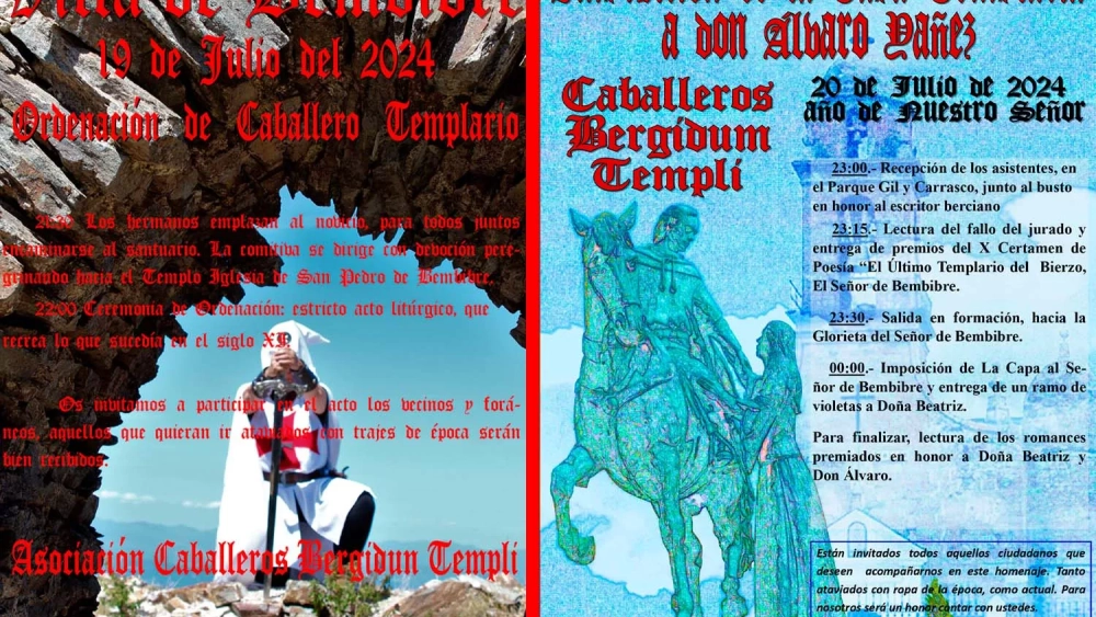 La Asociación Caballeros Bergidum Templi ha anunciado la ordenación de un nuevo miembro este viernes 19. Además, el sábado 20 se hará entrega de los premios de su concurso literario junto a un desfile que iniciará en el Parque Gil y Carrasco y tendrá final en la Rotonda del Señor de Bembibre.