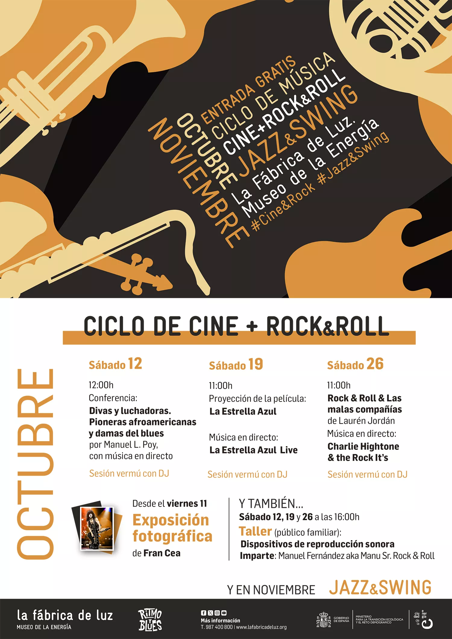El ciclo se abrirá el viernes 11 de octubre con la apertura de la exposición que recoge imágenes de conciertos firmada por Fran Cea, uno de los fotógrafos nacionales con mayor prestigio en el mundo de la fotografía de conciertos. Esta exposición alberga una retrospectiva de su paso por los fosos de salas y festivales durante casi dos décadas. La muestra podrá visitarse de manera gratuita hasta finales de noviembre en la nave de calderas de La Fábrica de Luz. Museo de la Energía.
