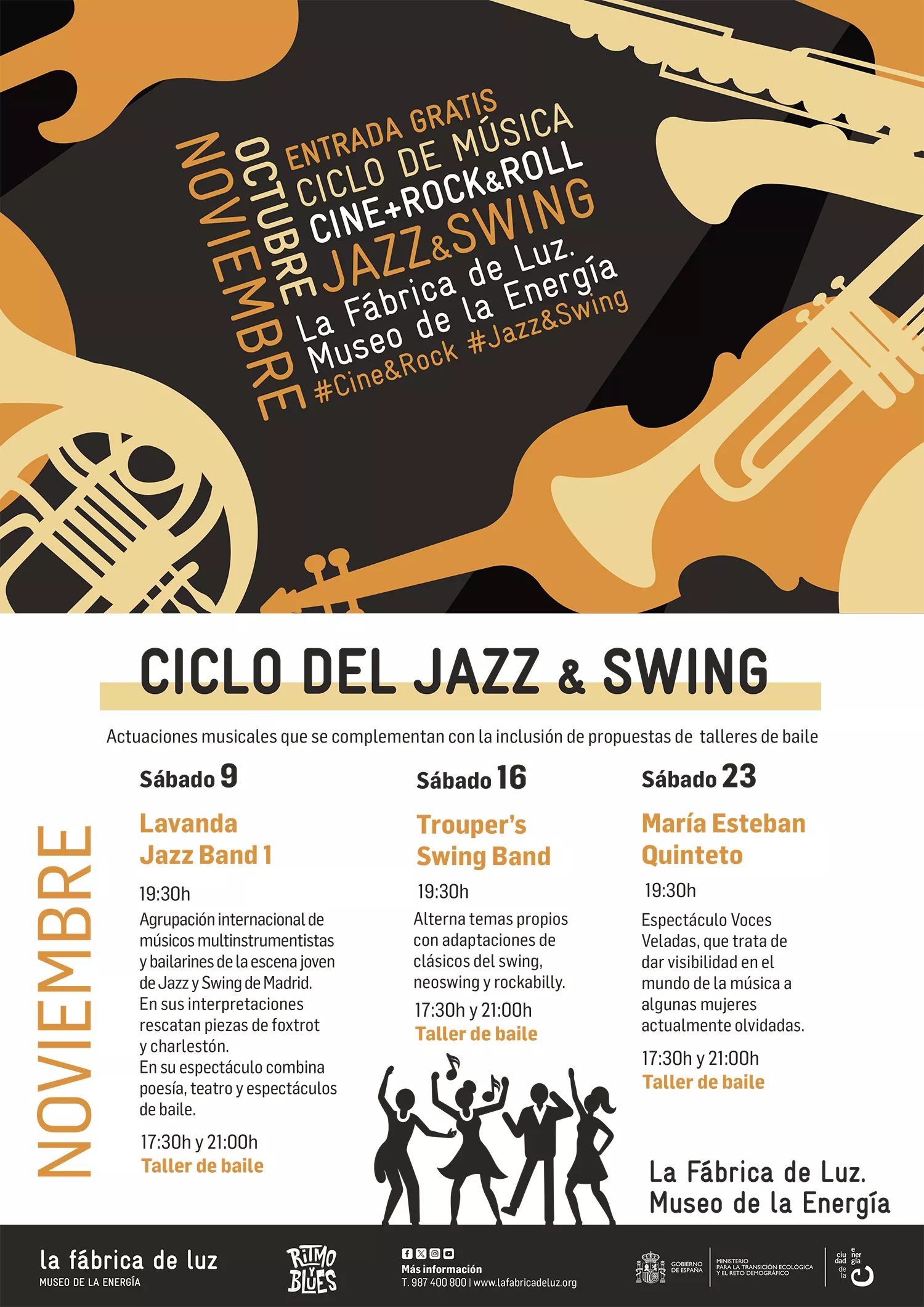 Durante el mes de noviembre y bajo el título de Jazz & Swing, tres de las formaciones emergentes del género en España visitarán Ponferrada para dar su visión de un estilo que ha definido el devenir de toda la música popular del siglo XX y el comienzo del actual. Lavanda Jazz desde Madrid, Trouper’s Swing Band desde Alicante y María Esteban Quinteto desde Barcelona y Málaga, llenarán de clase y buenas vibraciones el museo. Asimismo, se ofrecerán talleres y exhibiciones de baile para aprender los ritmos de la música afroamericana.