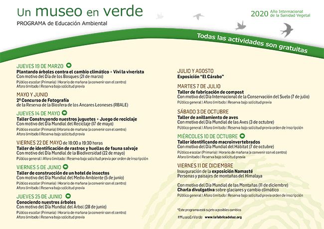 El primer taller tendrá lugar el 21 de marzo, Día de los Bosques, y consistirá en una plantación de árboles que se acompañará con una función de guiñol a cargo de los alumnos de la escuela-taller de Ciuden Vivero. El 17 de mayo, Día del Reciclaje, tendrá lugar un taller de construcción de juguetes y el 22 del mismo mes, Día de la Biodiversidad, se celebrará una sesión de identificación de huellas de fauna.