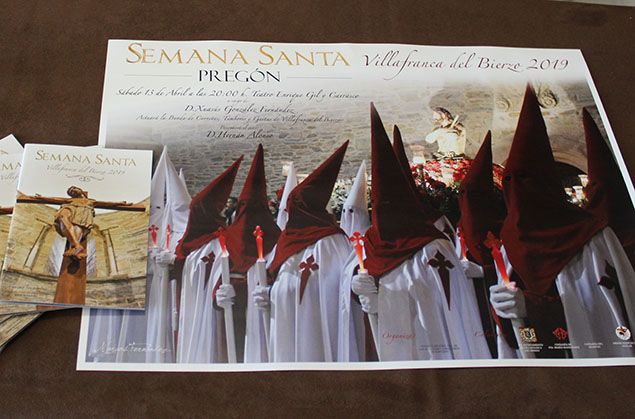 Cartel del pregón y programa de mano de la Semana Santa 2019 de Villafranca del BierzoLeonés, descendiente e Hijo Predilecto de Losada (Bembibre), experto en Semana Santa y muy vinculado a Villafranca del Bierzo. Esta es la descripción del elegido para pregonar este 2019 la Semana Santa de la Villa del Burbia, Xuasús González. El acto de inicio de las celebraciones religiosas será el sábado 13 de abril a las 20.00 horas en el Teatro Enrique Gil y Carrasco y contará con la actuación de la banda de cornetas, tambores y gaitas.