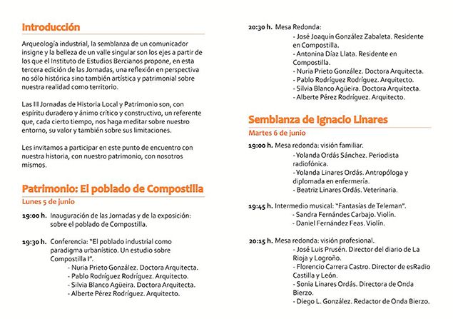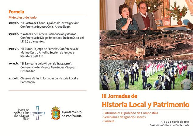El Instituto de Estudios Bercianos (IEB) ha organizado las III Jornadas de Historia Local y Patrimonio que se celebrarán los días 5, 6 y 7 de junio en la Casa de la Cultura de Ponferrada. El primer día estará dedicado al poblado de Compostilla, el segundo al periodista Ignacio Linares y el tercero al Valle de Fornela. El objetivo de las jornadas es "meditar sobre nuestro entorno, su valor y también sus limitaciones".