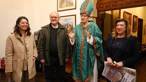César Sánchez / ICAL La concejala de Cultura y Turismo del Ayuntamiento de Ponferrada, María Antonia Gancedo (D), junto al administrador de la Real Fundación Hospital de la Reina, Antolín de Cela (2I), y los representantes de la compañía de teatro Dinámica TeatroEl monasterio de San Pedro de Montes y el entorno de la localidad en la que se asienta, Montes de Valdueza, serán escenario durante este mes de marzo de las visitas teatralizadas, a cargo de la compañía Dinamia Teatro, con motivo del 1.100 aniversario de la consagración de la iglesia del conjunto monástico a cargo del obispo San Genadio. Este personaje clave en la historia del monasterio será el gran protagonista del espectáculo, que ofrecerá cuatro funciones, los días 16 y 17 y 30 y 31 de este mes.