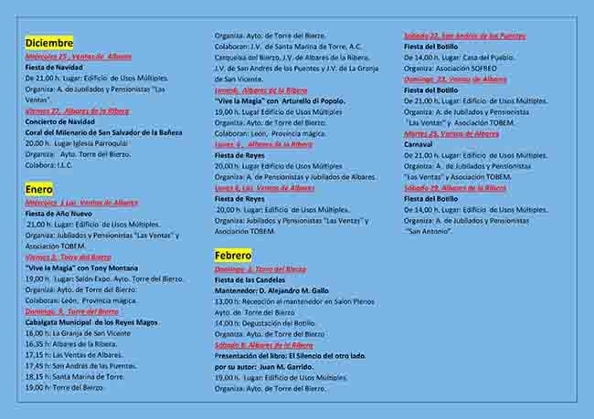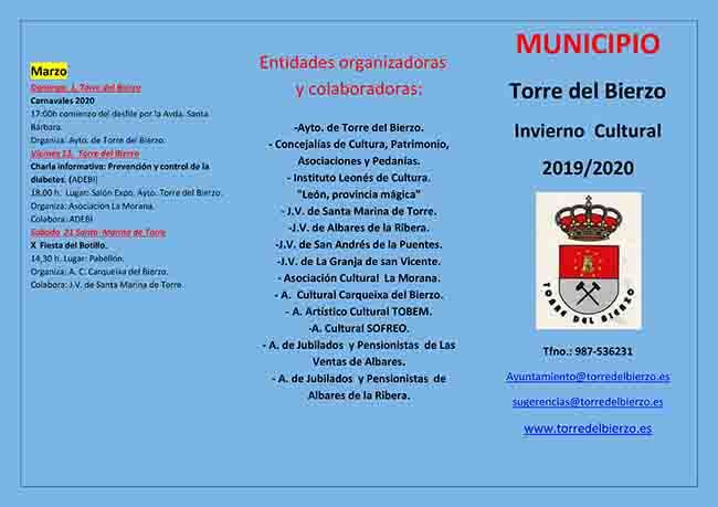 Otra de las actividades destacadas en el programa presentado por el Ayuntamiento serán los Carnavales, que se celebrarán el domingo 1 de marzo en el núcleo del municipio. Las Ventas de Albares se adelantará a las celebraciones, el 25 de febrero. Una conferencia sobre la prevención y el control de la diabetes y la presentación del cuarto libro de Juan Manuel Garrido completan el programa de actividades del invierno cultural del municipio de Torre del Bierzo.